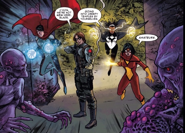 After the team discusses the situation and teleports to a temple in Indonesia, the action begins. Angela and Blade, separated temporarily from the group, confront this new foe for the first time, giving us a look at just how brutal these characters can be.