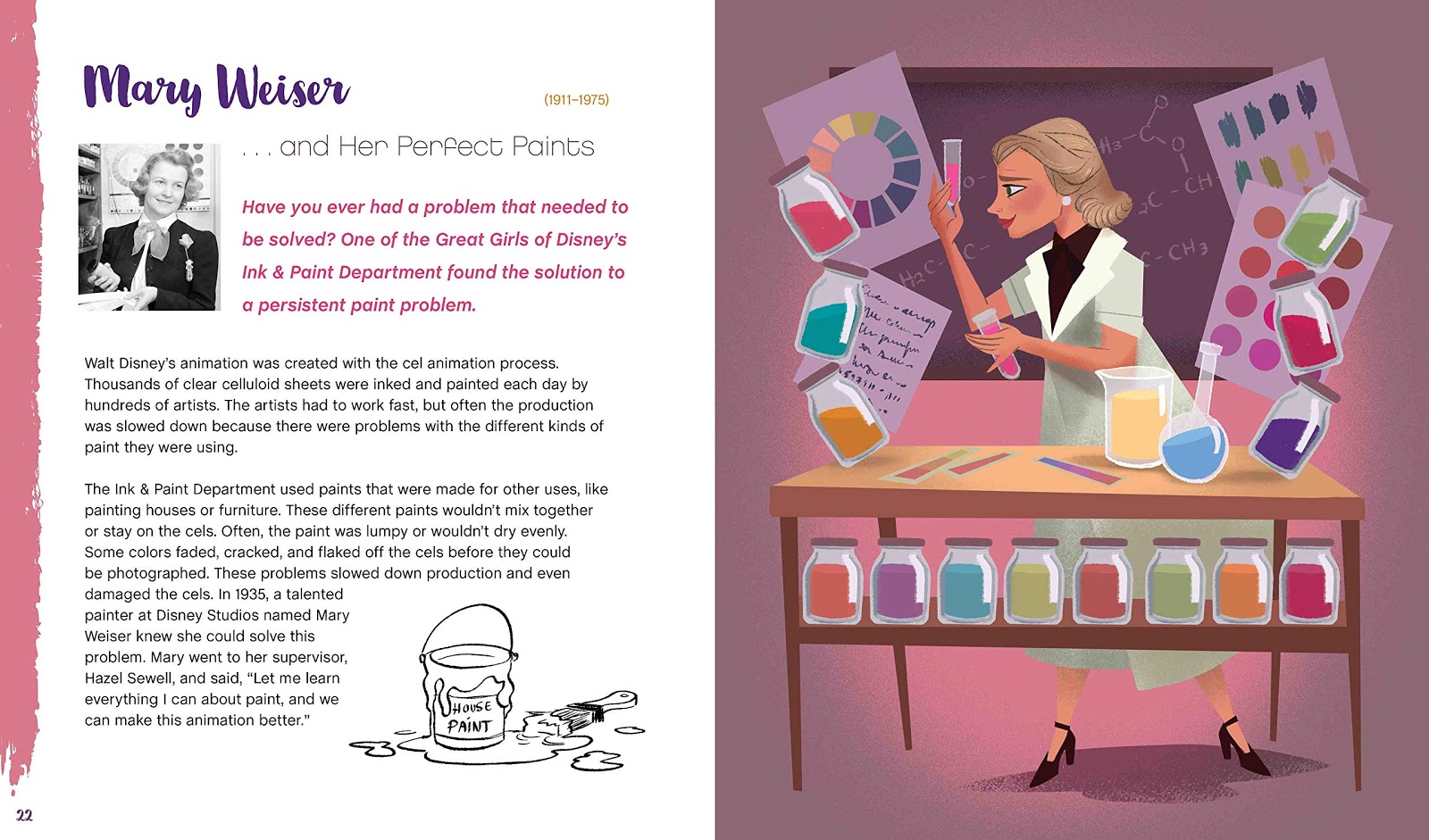 Splashy, vibrant, and full of whimsy, Pencils, Pens & Brushes is a history book of sorts designed for 8-12 year old readers. It shares the stories of 20 amazing women who contributed in a variety of ways to Disney’s movies. From drawing and painting to writing outlines for beautiful fairy tales, there were many women who played key roles in making the classic Disney films we love.
