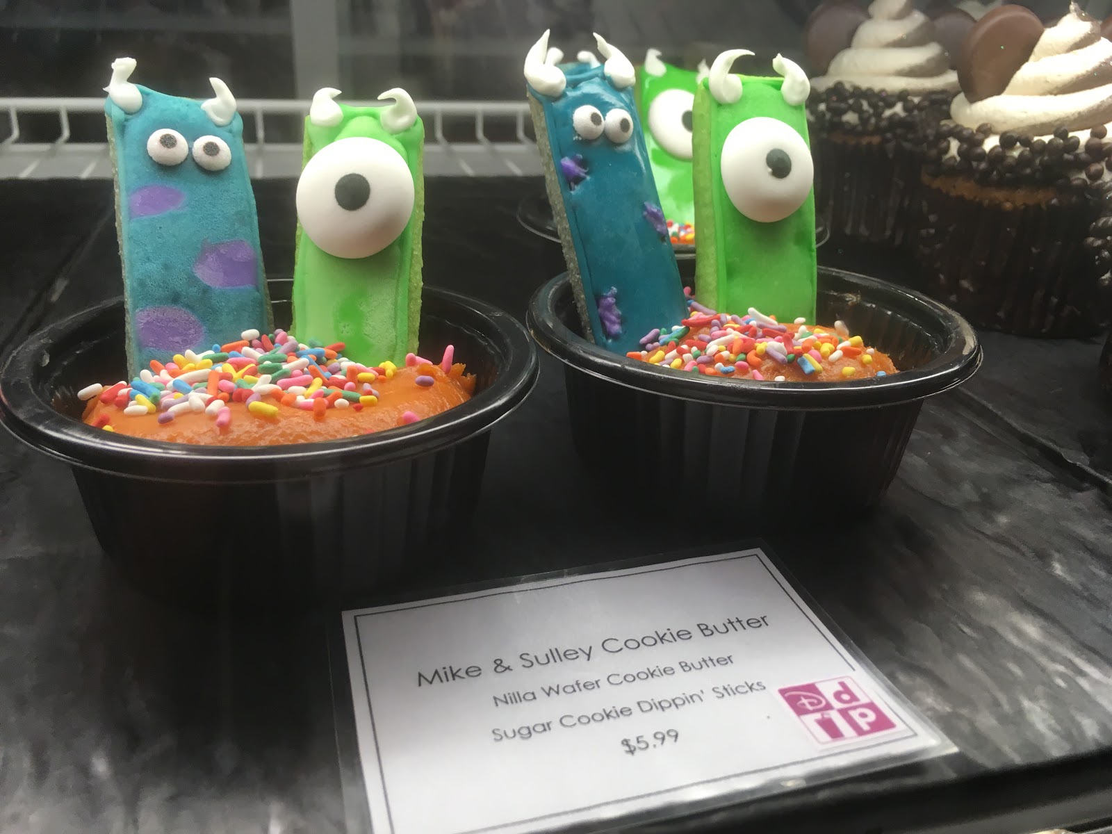 The Mike & Sulley Cookie Butter features two sugar cookie “dippin’ sticks” — one decorated as Mike Wazowski and the other as James P. Sullivan A.K.A. Sulley — served in a cup of Nilla Wafer Cookie Butter topped with rainbow sprinkles. Each cup comes at a cost of $5.99 (plus tax). And, while it’s not exactly a cupcake, Cast Members placed the dessert in a cupcake container, making for easier transport back to our room.