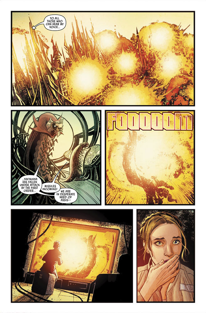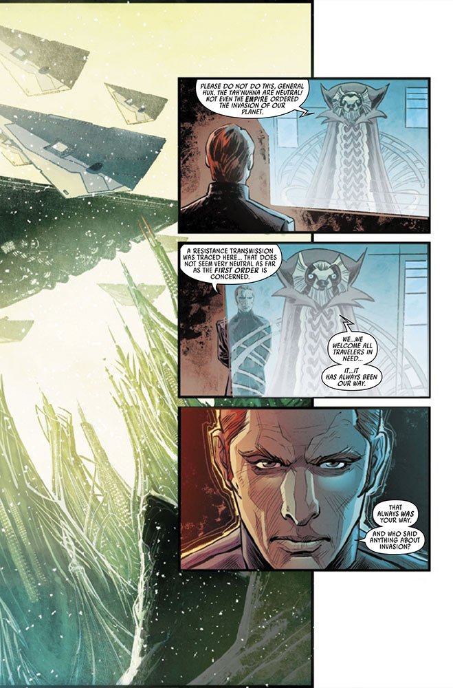 And so Leia, Rose Tico, and Rey take the Millennium Falcon to Mon Cala in the hopes of reassembling old allies. Meanwhile, Finn and Poe Dameron are visiting the Wayward Comet refueling station in search of a cache of weapons the New Republic once confiscated from a band of pirates, which will, as Finn says, “give the Resistance a fighting chance against the First Order.” Along the way they are spotted by the shapeshifting Clawdite Remex Io, who (along with the Kendoh Gang previously featured in Marvel’s Star Wars: Galaxy’s Edge series, which actually takes place after Allegiance) calls in General Hux to claim the bounty on Finn’s head.