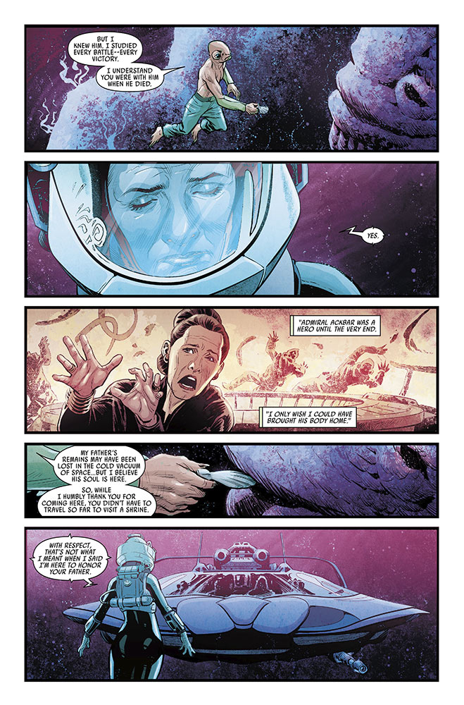 In this installment, we pick up where issue #1 left off with General Organa, Rey, Rose Tico, and C-3PO arriving on Mon Cala in search of reinforcements for the Resistance, though they are only met with suspicion and hostilities-- especially from the Mon Calamari’s sister species the Quarren. It seems the residents of this planet (once a key Rebel Alliance stronghold) have grown bitter due to hardships they’ve faced after decades of war, not to mention the recent loss of local hero Admiral Ackbar.