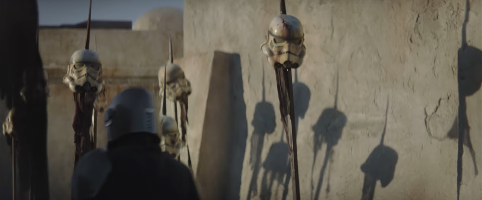 The second shot is also the same as in the previous trailer. Stormtrooper helmets on spikes, their shadows cast against the wall of an aging building on what is presumably a desert planet. The Mandalorian’s head passes through the frame. He’s on his way somewhere, determined.
