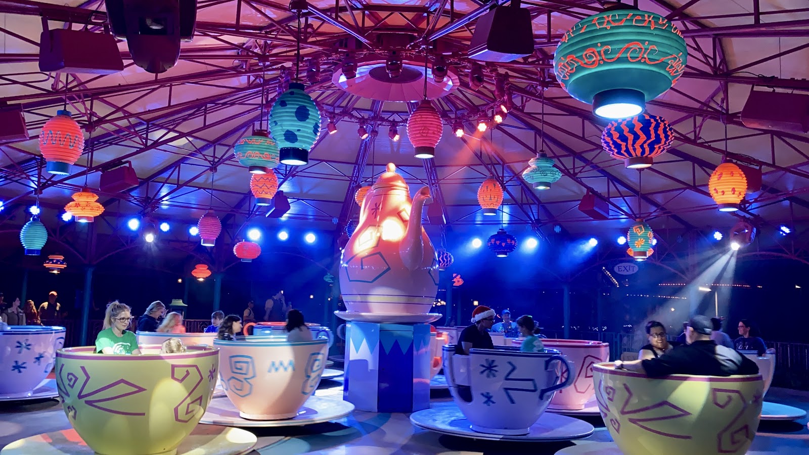 Sure you could spend your entire night visiting treat stations and getting amazing cookies (all pre-wrapped) and holiday drinks, but new this year are a few attraction overlays. Sadly, there’s still no Country Bears Christmas Special though. Anyway, returning this year is the Mad Tea Party overlay with lots of fun lights and holiday music taking over the normal day version.