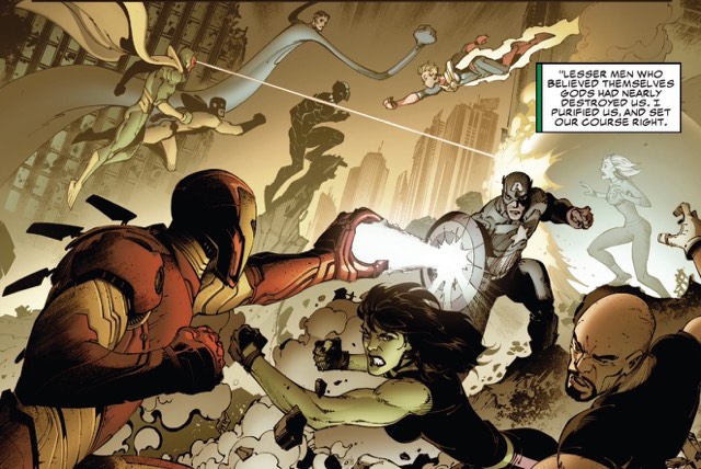 Another plot point I liked about this new issue is that Doom somehow eliminated all of the heroes. There isn’t a whole lot of detail on how he accomplished this, but the imagery does hint at it having to do something with the Civil War story arc, which would make sense as it would be the time at which the heroes were completely divided and at their most vulnerable.
