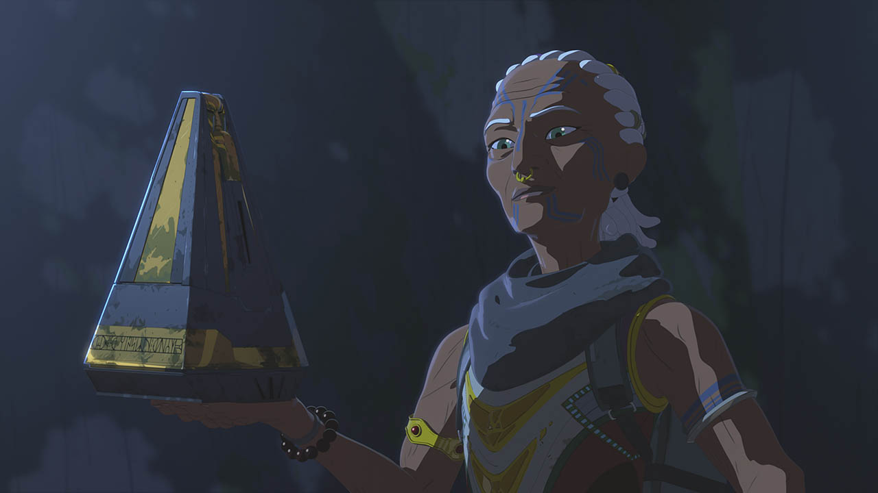 Venturing further down one of the corridors, they immediately trigger a series of booby traps and fall into separate underground chambers. Kaz makes his way into a larger room and comes across a strange holocron-shaped relic on a pedestal in its center. Despite a warning from the voice not to touch it, Kaz-- clumsy as always-- reaches out to grab the artifact and sets off a trap door, causing him to fall down another level. There he finds the source of the voice: an old woman named Mika Grey (Tudi Roche) who demands to know if he works for the First Order.