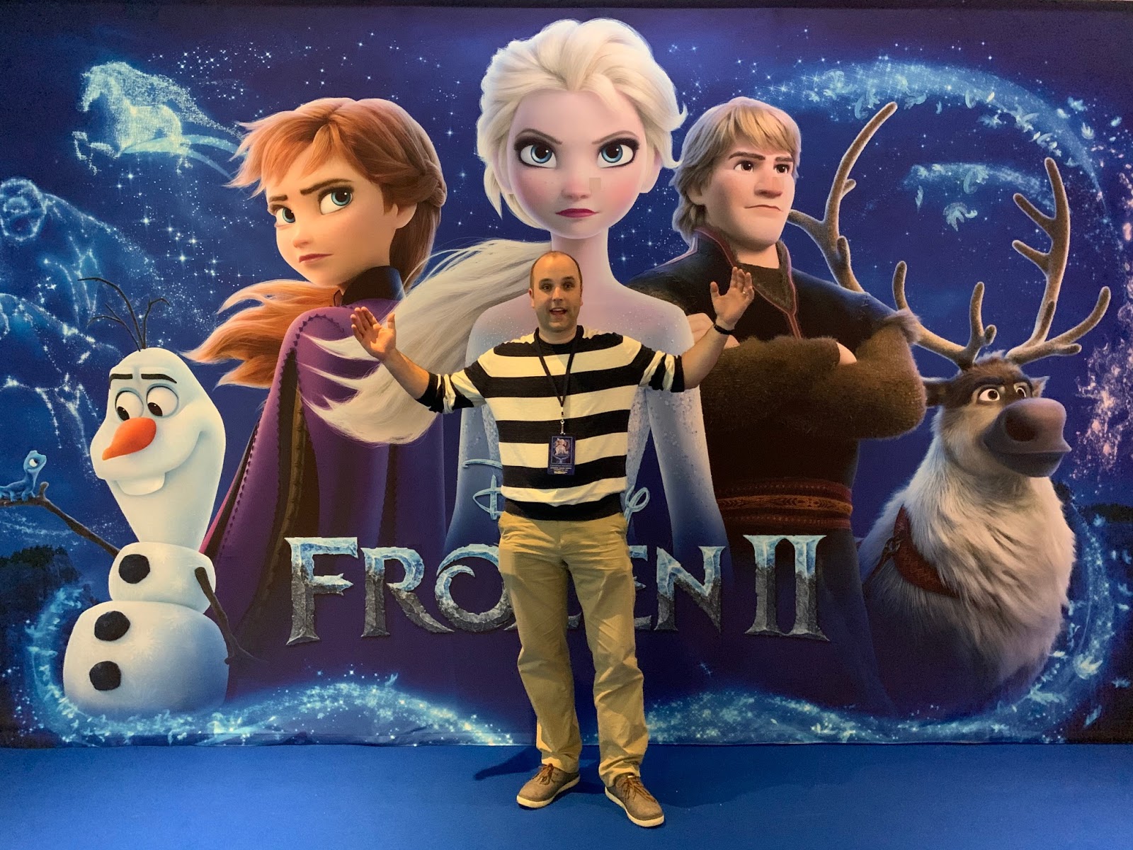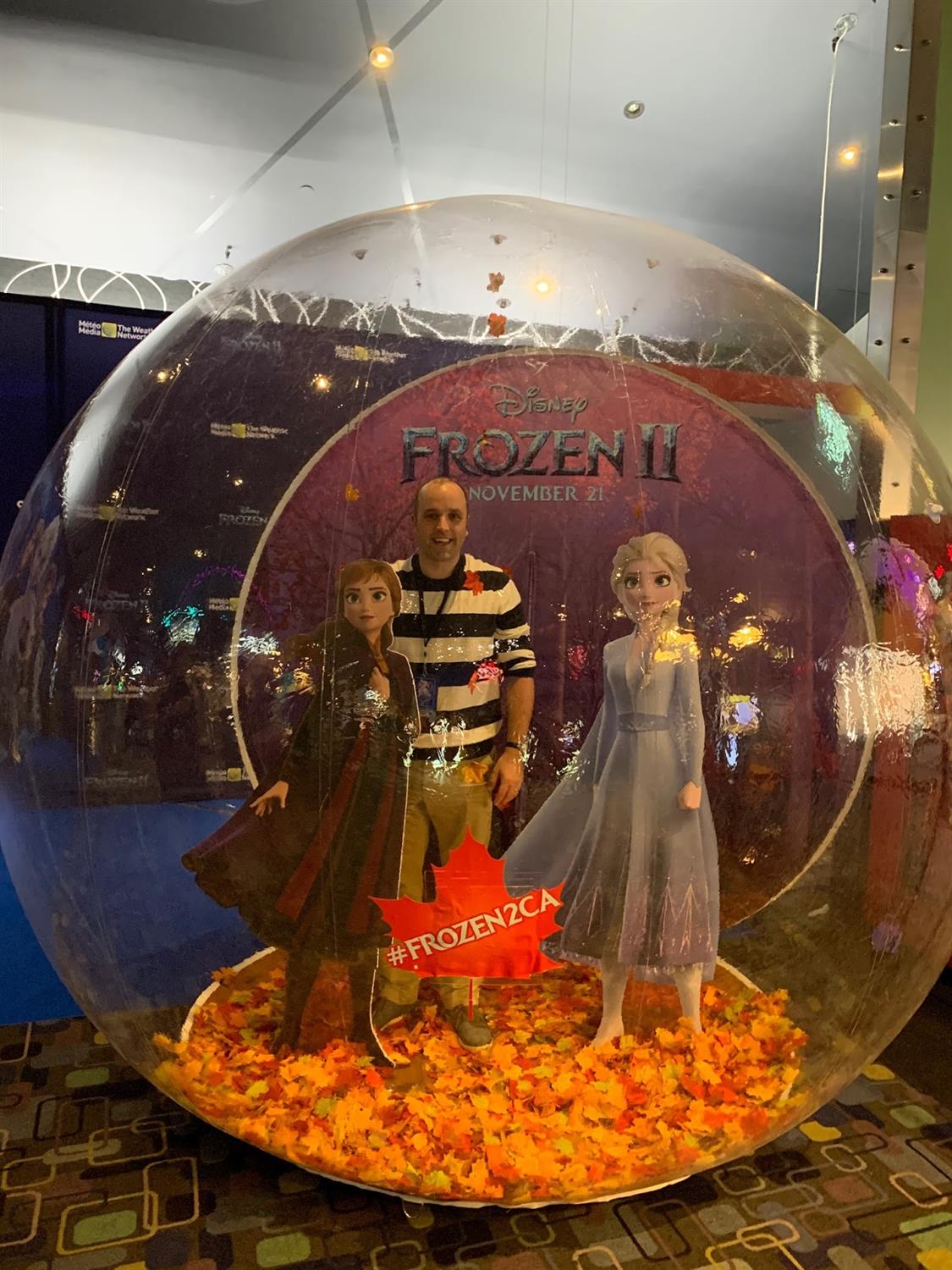 The major attraction of the preshow festivities was the life-size glitter ball. Inside were life-sized cardboard cutouts of Anna and Elsa going into the woods with the Frozen 2 sign in front. I made my way to the line and waited patiently to climb into the human hamster ball of fun. The theatre employee graciously took my photos, as I threw the leaves up into the air, like I was a part of the crew and off on an adventure into the unknown.
