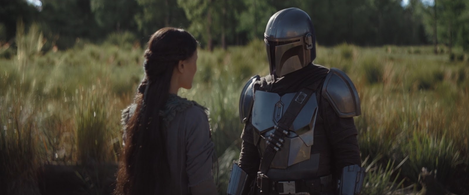 When the mercs discover that the raiders have somehow managed to take control of an ex-Imperial AT-ST Walker, they decide to help the villagers train to fight alongside them and take down their aggressors once and for all. During their time in the tranquil encampment, the Mandalorian becomes the object of a peasant woman’s (Westworld’s Julia Jones) desires, and we learn a little bit more about the responsibilities and consequences of wearing-- not to mention removing-- that distinctive armor.