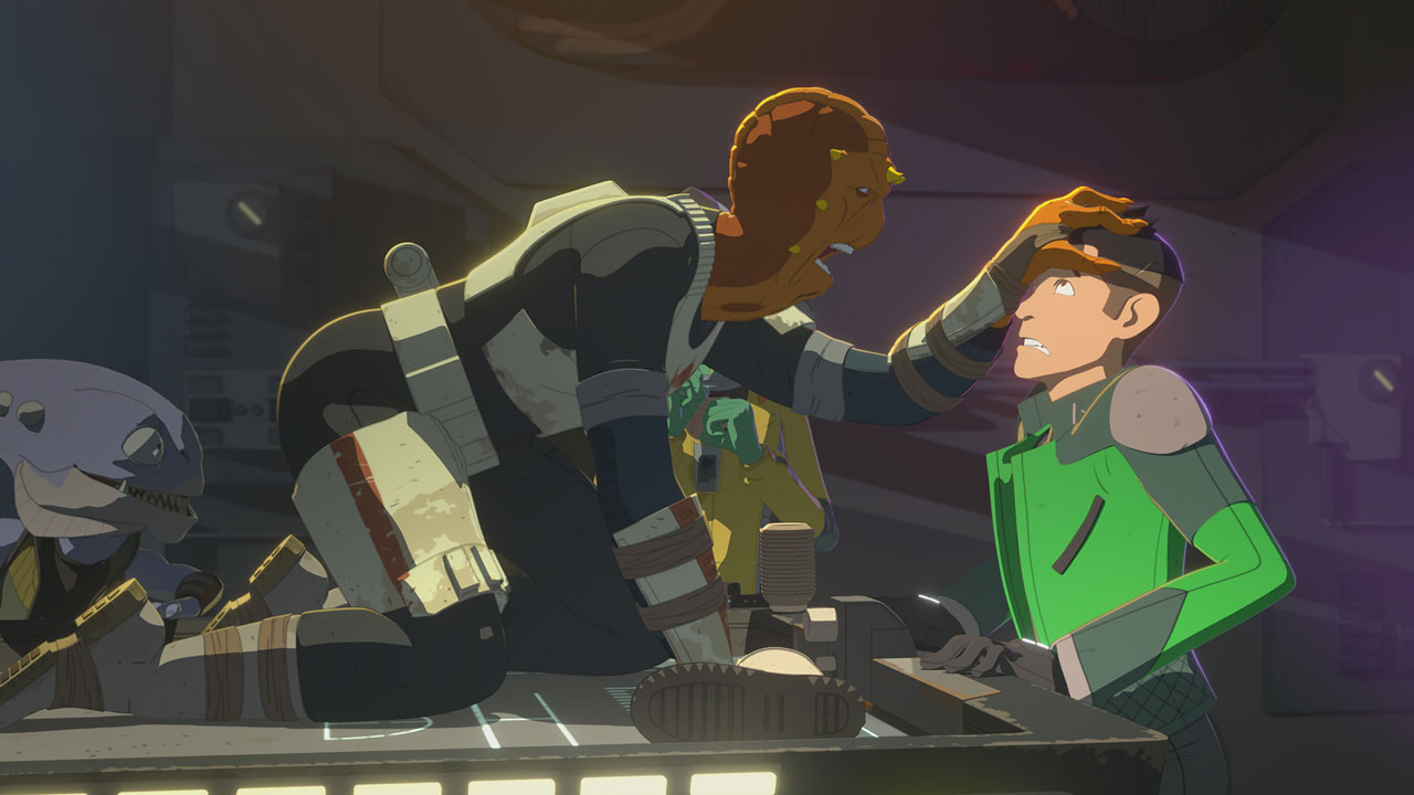 “Kaz’s Curse” begins with Kazuda Xiono (voiced by Christopher Sean) gambling with the pirates aboard the Colossus. He’s having an unusual streak of good luck until one of the buccaneers named Leoz (voice actor Steve Blum of Star Wars Rebels fame) gets fed up with Kaz’s repeated winnings and puts a curse on the young Resistance spy.