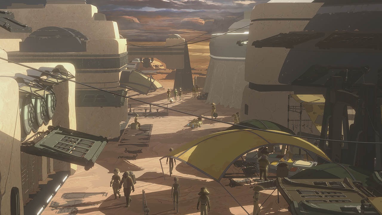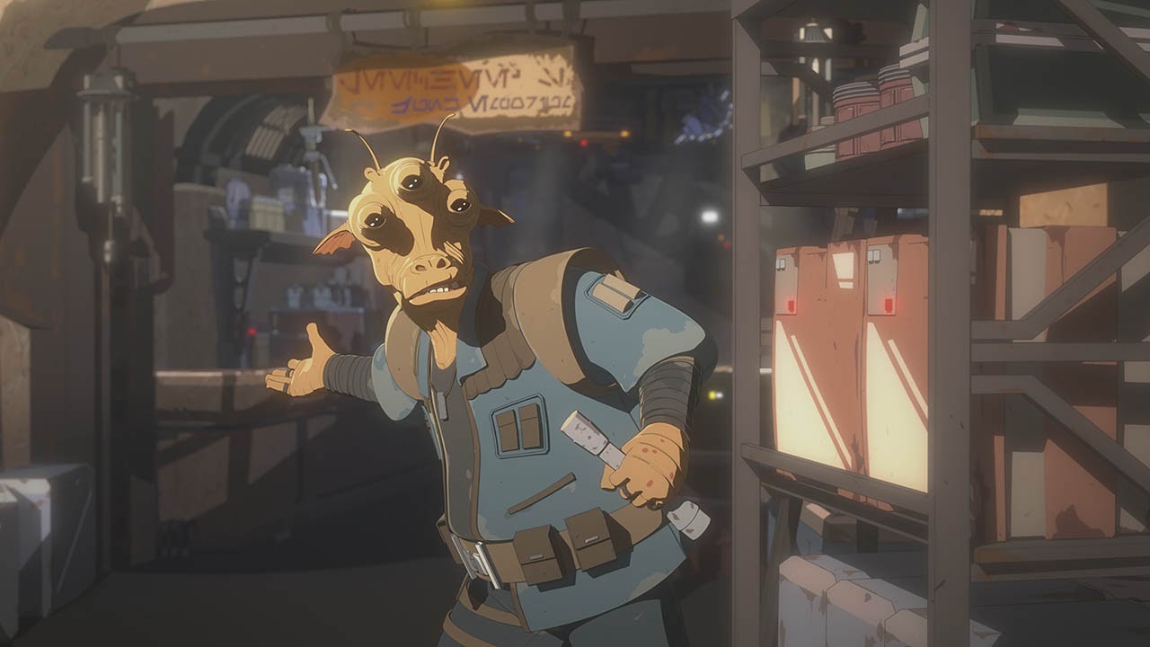 Aboard the Colossus, Kazuda Xiono (Christopher Sean) picks up the distress call, but Captain Doza (Jason Hightower) says it feels like a trap. But Jarek Yeager (Scott Lawrence) backs Kaz’s desire to check it out, so he and Synara San (Nazneen Contractor) join him on an expedition down to Vargo Spaceport with droid CB-23. On their way to the spot where CB is honing in on the signal, they’re spotted by a Gran shopkeeper named Lechee (former Saturday Night Live cast member Fred Armisen) who turns out to be an informant for Ax.