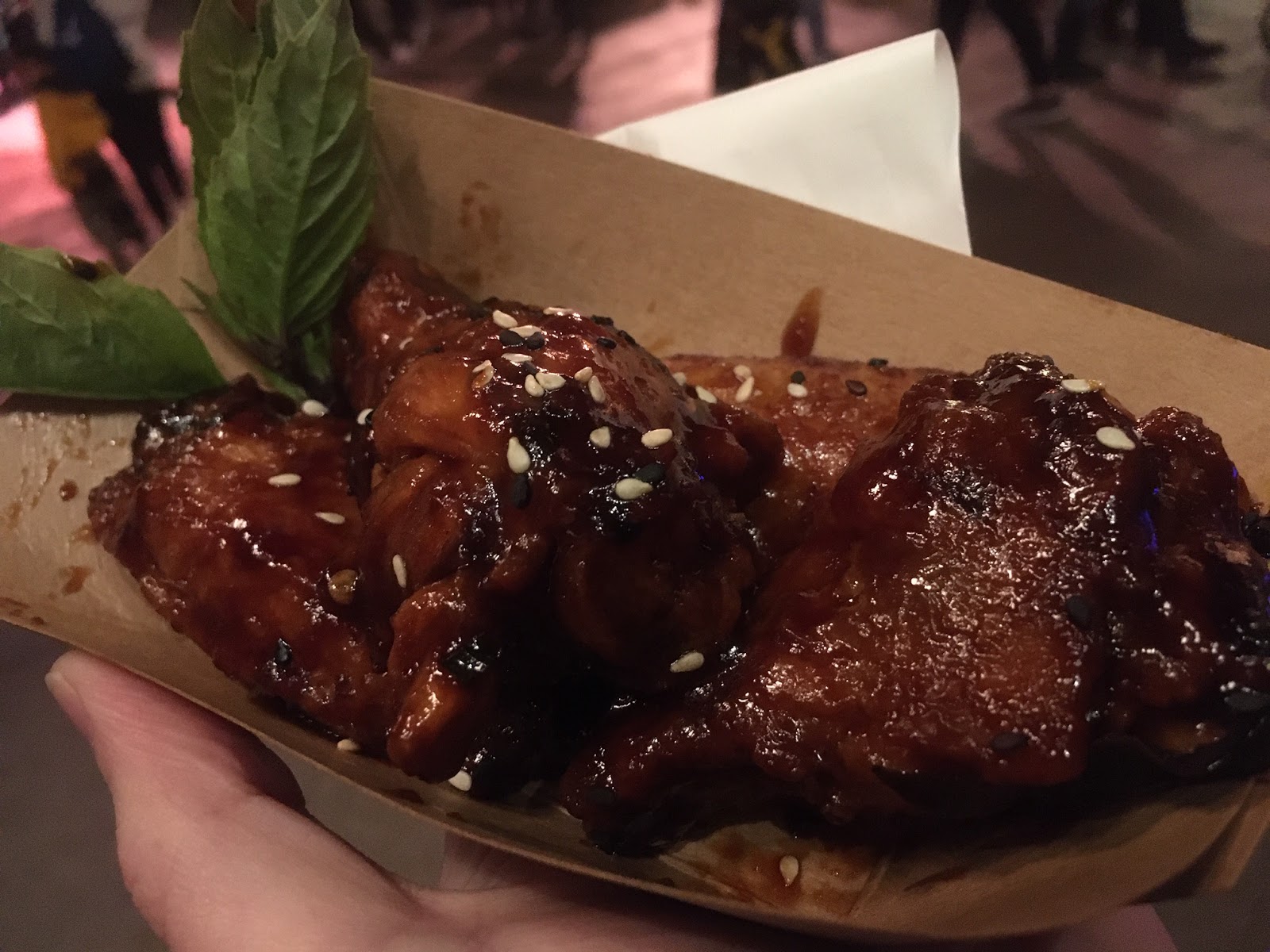 The first thing that caught my attention when I received my order was how hefty the serving was. Maybe I’ve grown too accustomed to Food & Wine Festival proportions and pricing but I was pleasantly surprised by the four sizeable wings this $7.50 dish included. More specifically, my particular plate included two drumsticks and two wings — and I might have been singing a different tune had that mix skewed toward the latter.