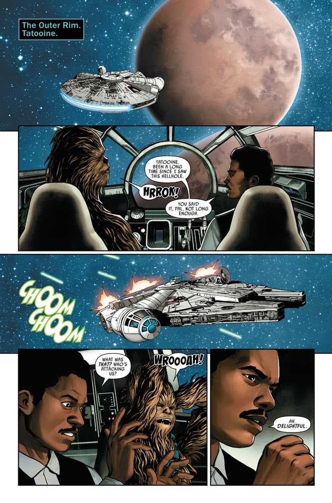 This may be the first run of the Star Wars comic that actually matches the feel of the movies that surround it, and that means it also comes across as a tiny bit divorced from the comics that preceded it (there’s no Dar Champion or Warba Calip to speak of) but that’s perfectly fine with me. Soule has somehow figured out a way to fill in the gaps between Episodes without having the content feel like filler, and that’s a feat worthy of tremendous praise. Some of the individual scenes in Star Wars #2 could convincingly be presented as deleted scenes from Empire, as the first act of this issue is set prior to Lando leaving the Rebel Alliance fleet to look for Han on Tatooine. It did bother me a little that they switched who was piloting the Millennium Falcon and who served as co-pilot, but I get it. After all, it’s not wise to upset a Wookiee.
