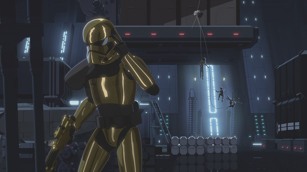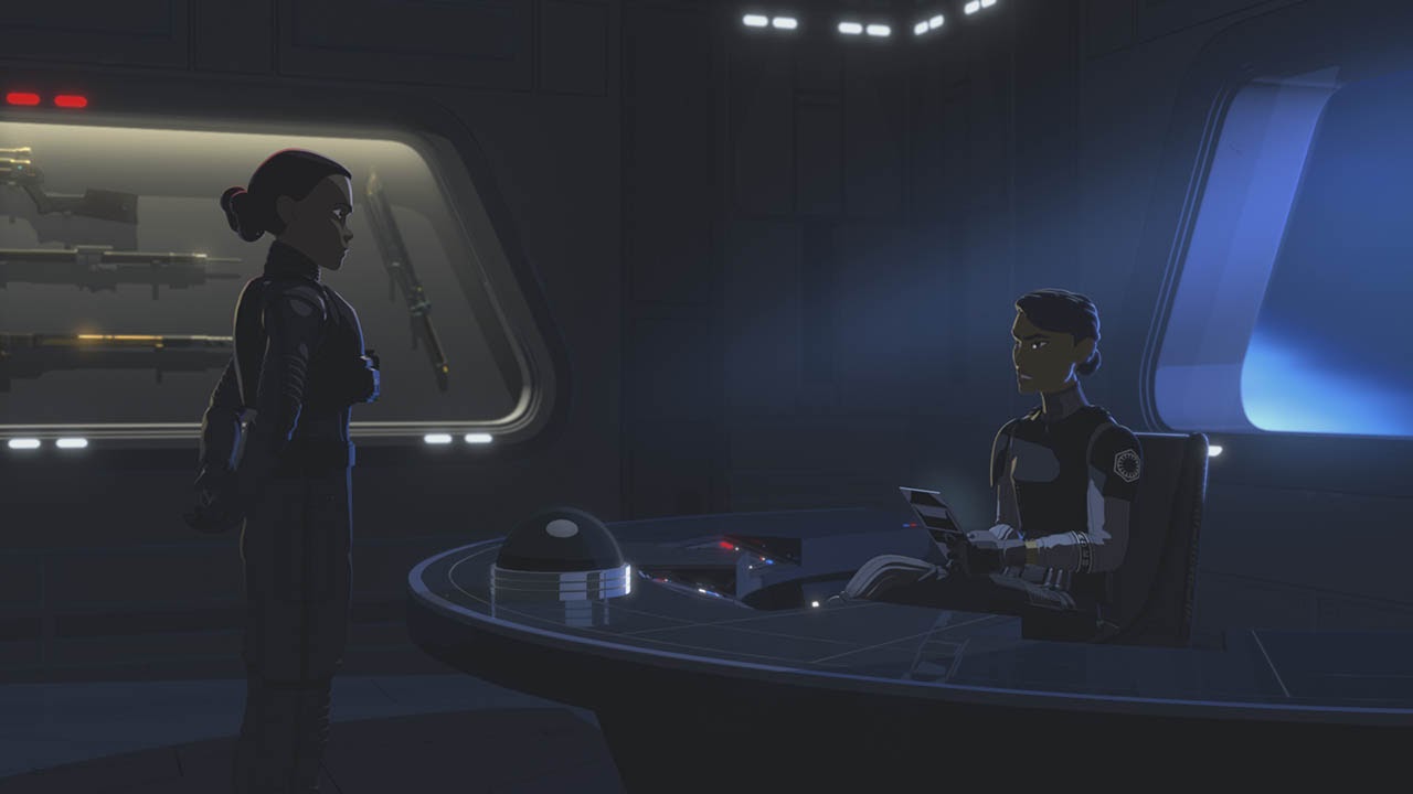 At the beginning of the series finale “The Escape,” Rucklin tells Tam a big mission is coming up for their Star Destroyer. They arrive at the planet Aeos with numerous other capital ships and begin firing on the native population as retaliation for harboring the Resistance. Tam gets very upset by this and runs off to be by herself. She finds a Mouse Droid updating the ship’s computer systems and reprograms it, saying “You’re going to help me get out of here.” Agent Tierney attempts to report to General Hux when suddenly Kylo Ren (voiced here by Matthew Wood, not Adam Driver) steps into the holotransmission. Ren threatens Tierney and Commander Pyre (Liam McIntyre) by Force-ing them to pull their blasters on each other, and Pyre says they will double their efforts in finding the Colossus.