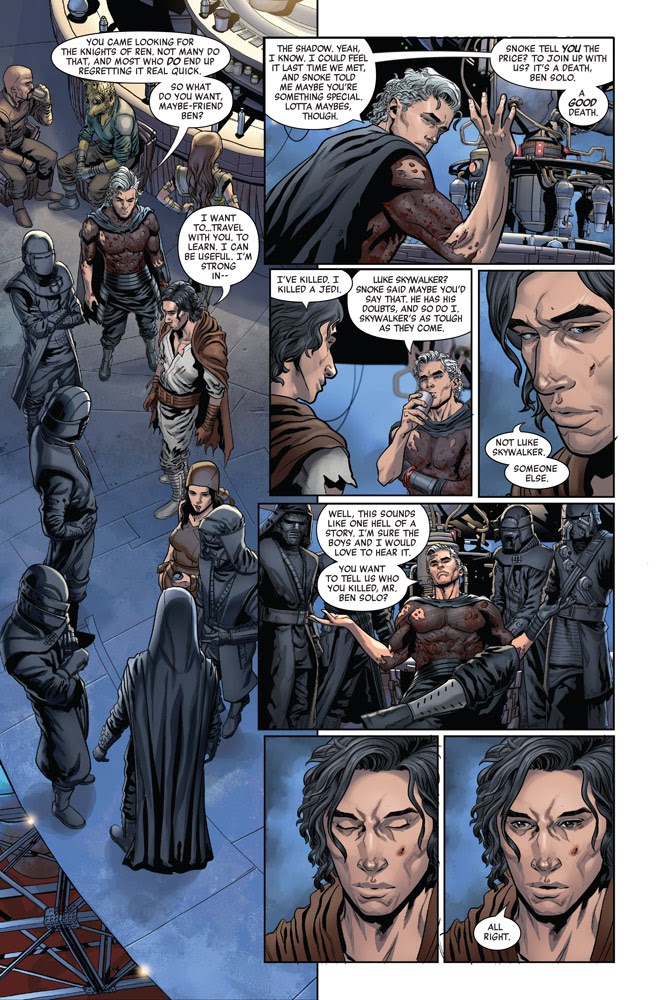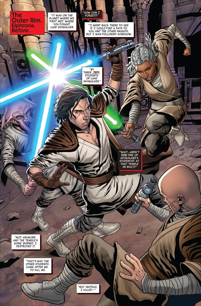 Seeking to cement his place at Snoke’s side and find a new path in the galaxy, Ben Solo has traveled to the planet Varnak in the Mid Rim in search of the Knights of Ren, whose showdown with Luke Skywalker we saw last issue. The knights are intrigued but otherwise unimpressed, and they inform Ben of their initiation ritual: he must cause a death, but not just any death. Ben then relates the tale of how he faced off with three of his former fellow students (namely Voe, Tai, and Hennix-- two humans and one Quarren) on Elphrona, the site of an ancient Jedi outpost.