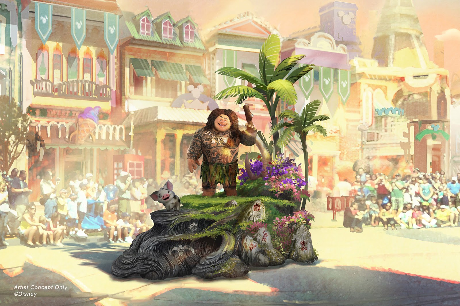 The opening dancers join Mickey, then Minnie Mouse, Donald Duck, Goofy, and Chip ‘n’ Dale-- all in sparkling new outfits fashioned specifically for “Magic Happens”-- to lead the way for all that comes after down the Disneyland parade route. They’re followed by the Moana float, which was described to us as “artistry in motion,” with the magic of the ocean embedded into its design. Here, technology enhances the storytelling through the use of an LED screen with animation giving viewers a window into the deep through Moana’s eyes. Ocean dancers also represent waves and utilize new toys they play with along the route.