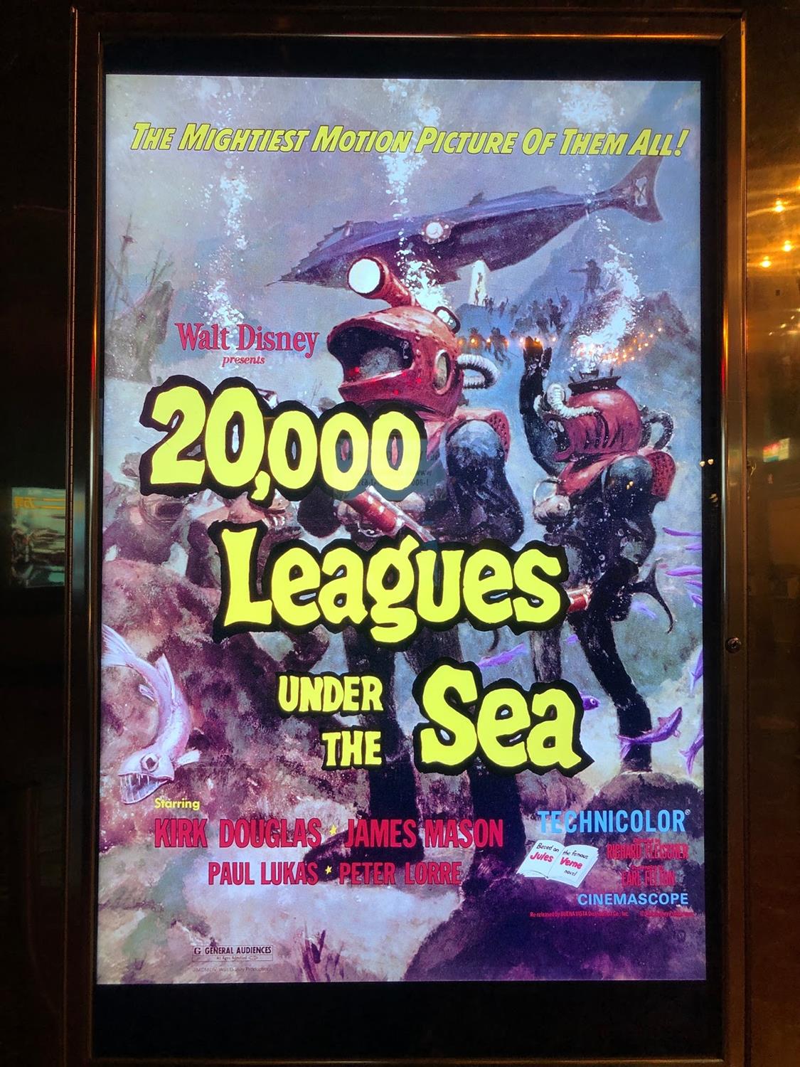 Inside the El Capitan Theatre lobby, a display of 20,000 Leagues Under the Sea memorabilia was on exhibit, featuring a Nautilus submarine model, children’s books, toys, games, puzzles, and a Captain Nemo statue.