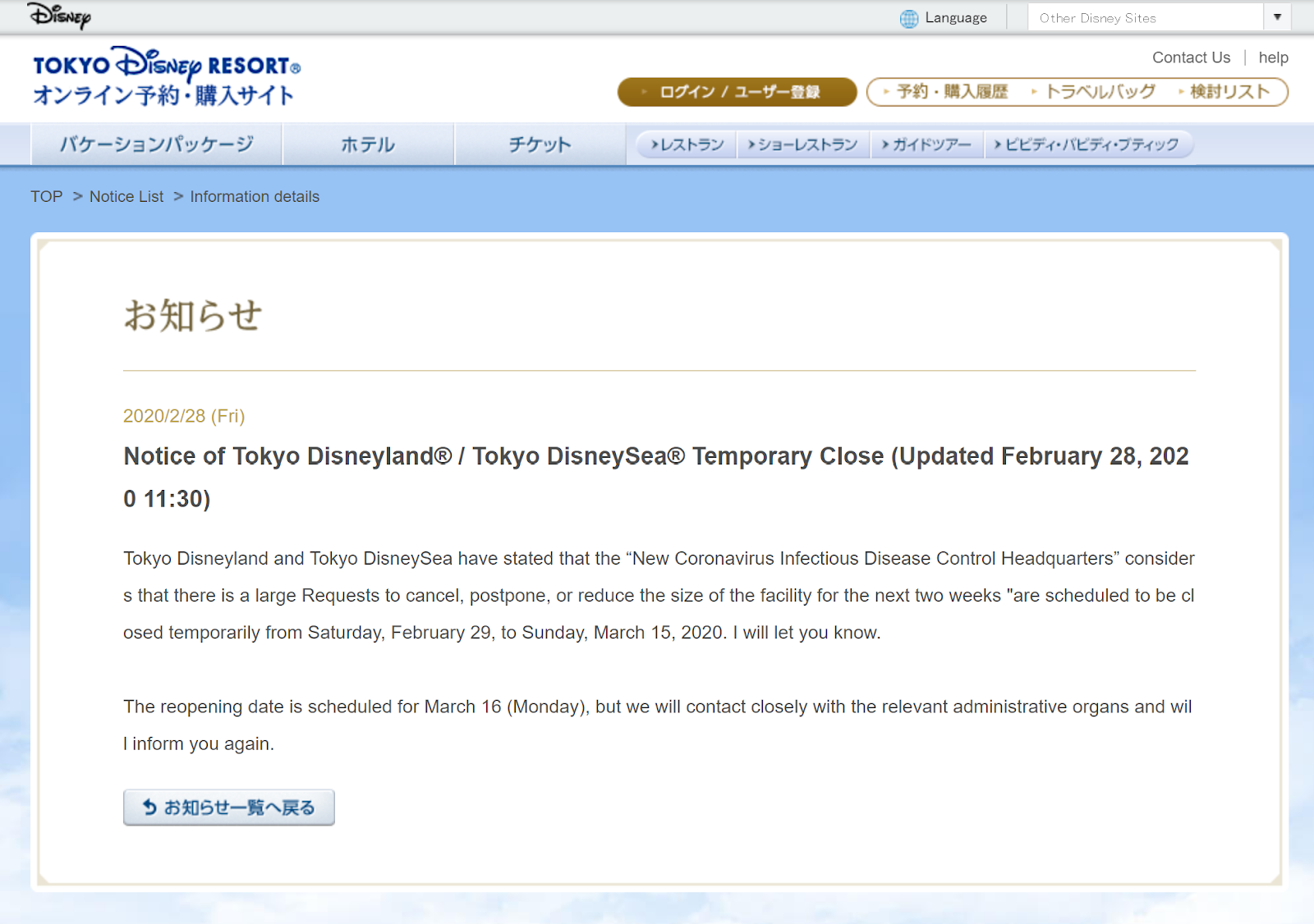 While the English version of the Tokyo Disney Resort Website has not yet been updated to reflect the closure, the Japanese language version has, and below is an image of the closure page translated by Google.
