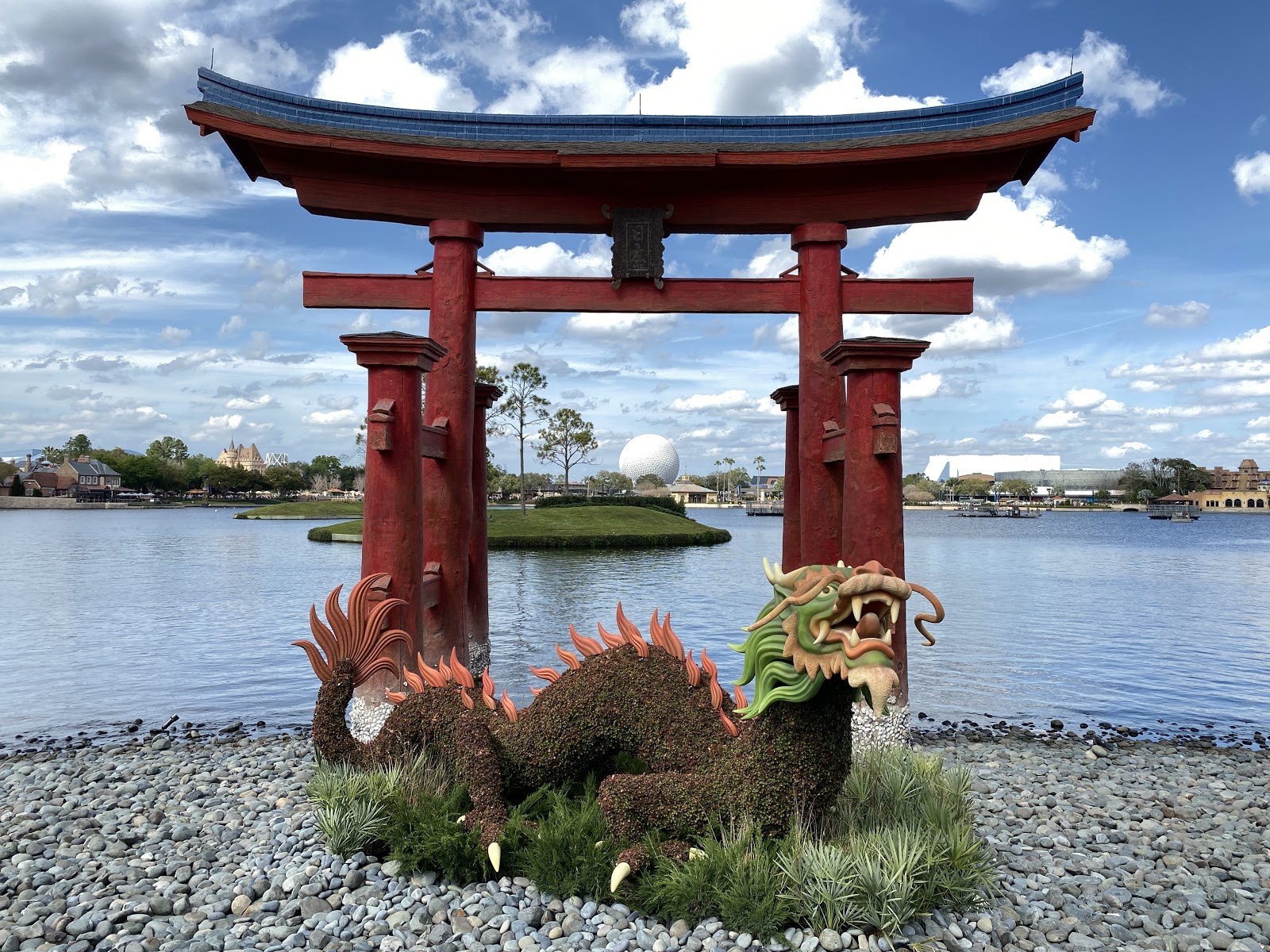 A spiked dragon guards the traditional torii gate in front of the Japan Pavilion. This serpent seems to know he’s at Walt Disney World as he seems to be smiling...we think!