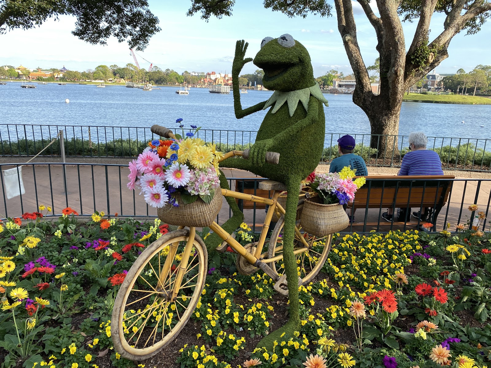 Hi-ho! Kermit is pedaling his way through World Showcase. He’s even picked up a basketful of flowers. Hmm could those be for Miss Piggy?