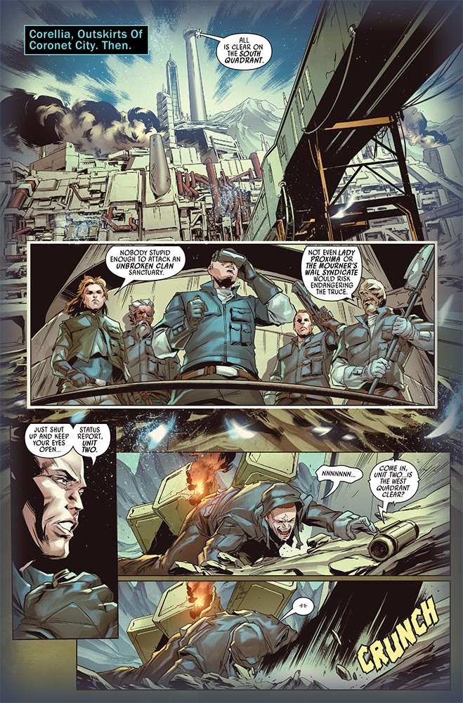 This premiere issue of Star Wars: Bounty Hunters spends the bulk of its time setting up the story to come in future installments, though it still has enough action and character moments-- it’s even got a cameo appearance by everyone’s favorite space archaeologist-- to make it entertaining on its own. My only real gripe is with the artwork by Paolo Villanelli (also of Jedi: Fallen Order - Dark Temple). His depictions of each persona are fine on their own, but the staging of the book’s action is a little clunky and I found myself going back to reread certain sections a few times in order to make sure I understood what exactly was happening. It doesn’t help that they’re trying to be mysterious about a few particular reveals, but there has to be a way to do that kind of thing more clearly.
