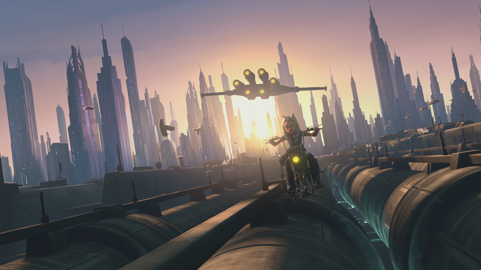 Riding a swoop bike into Coruscant’s underworld, Ahsoka nearly meets her demise when her vehicle malfunctions, but she manages to bring it to a semi-safe landing at a fix-it garage. There she meets Trace Martez (Brigitte Kali), the shop owner and mechanic. Ahsoka doesn’t have money to pay for her bike’s repairs, so Trace offers to let her stay in the garage and do the work herself.
