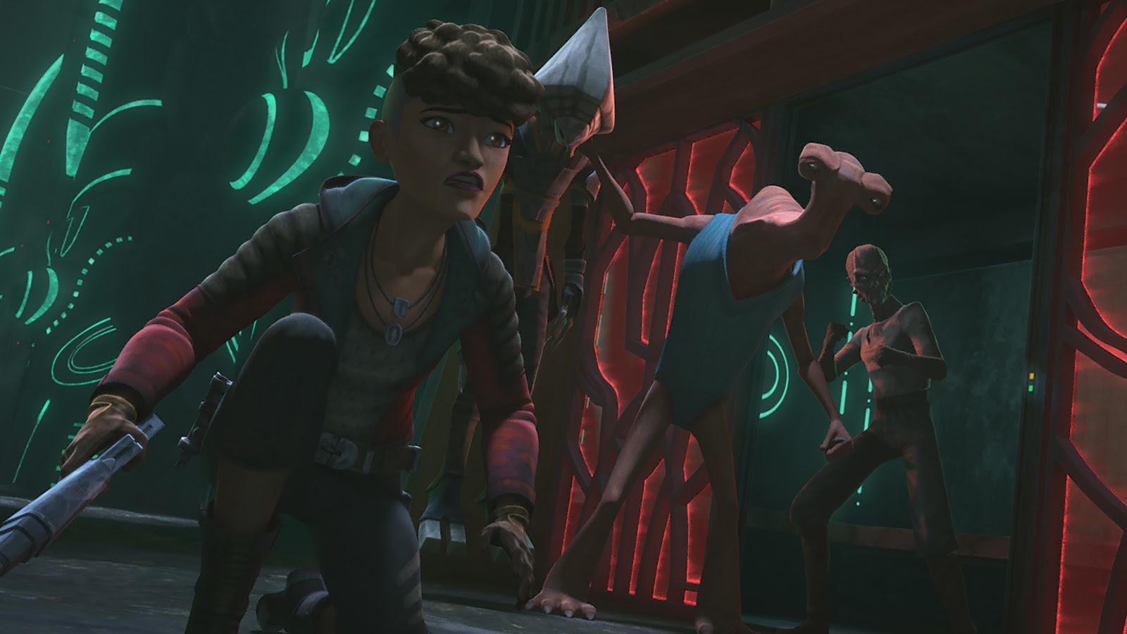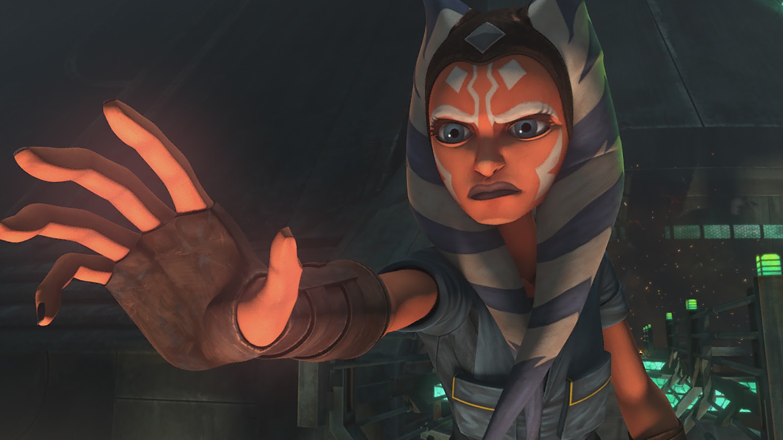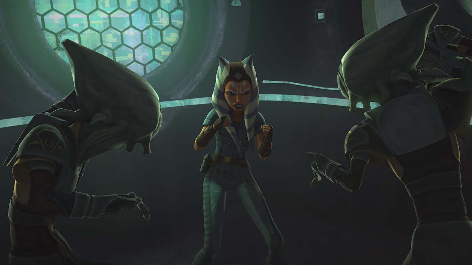 The three make their way out of the facility while fighting the guards in blaster combat. They make a dramatic leap over a retracting walkway, and Ahsoka uses the Force again to help Trace grab ahold of the far-side ledge. “That’s not normal,” says Rafa as the Togruta jumps clear over their heads. The trio separate so Ahsoka can disable a large gate while the sisters distract the remaining guards. Another firefight breaks out and Ahsoka uses the Force yet again to help Trace and Rafa in their battle.