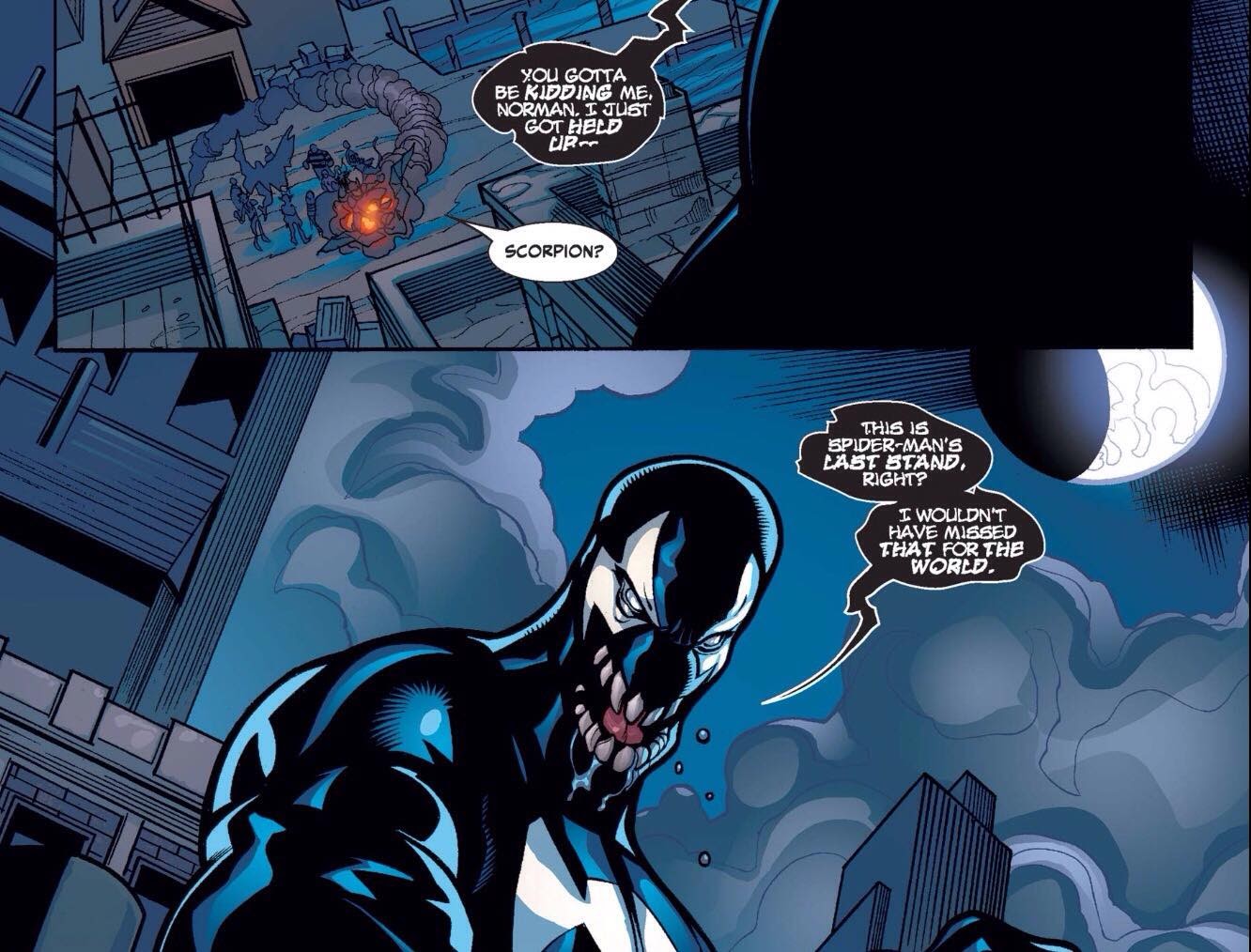 After splitting from Brock (and after a very brief stint with the son of a crime boss) the symbiote bonded to Mac Gargan, who had previously given Spidey fits as the villainous Scorpion. Gargan was bonded with Venom through some of Marvel’s most memorable stories, including “Civil War” and “Dark Reign.”