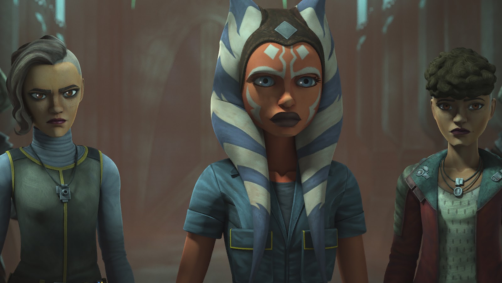 Hello and welcome to Laughing Place’s weekly recap of the seventh and final season of Lucasfilm Animation’s Star Wars: The Clone Wars on Disney+. This week’s episode, entitled “Together Again,” picks up right where the previous installment left off, with Ahsoka Tano (voiced by Ashley Eckstein) still imprisoned by the Pyke Syndicate along with her new frenemies Trace Martez (Brigitte Kali Canales) and her sister Rafa (Elizabeth Rodriguez).