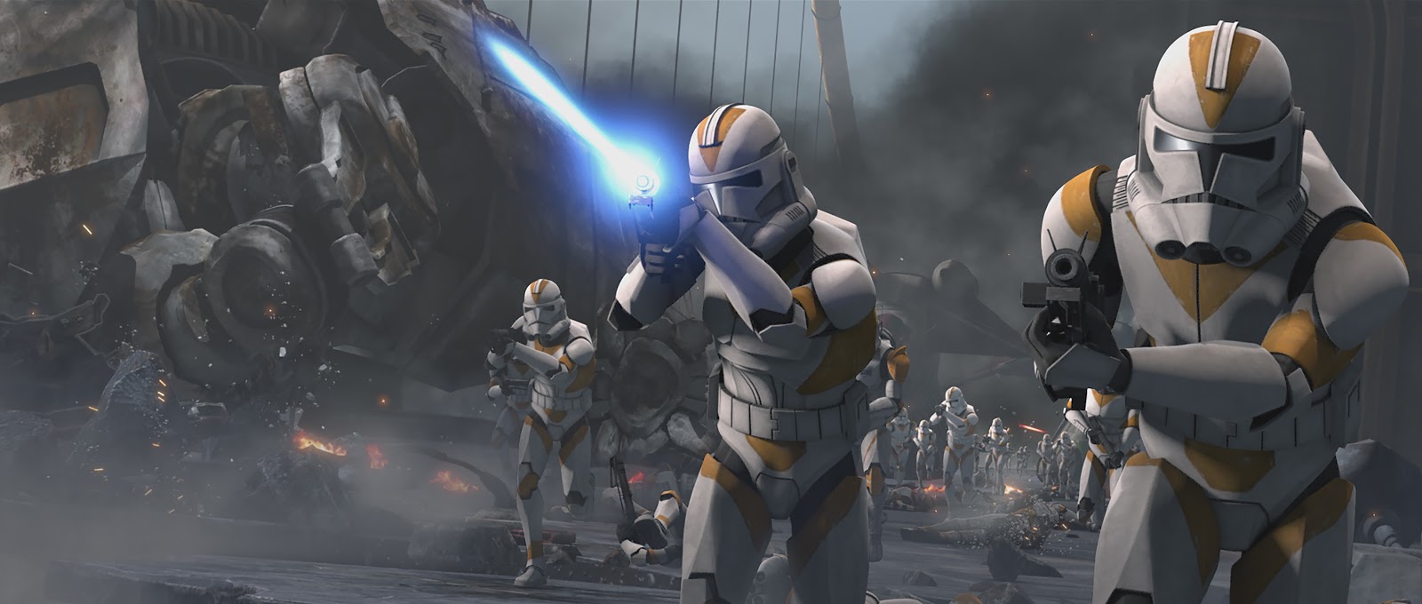 We find Commander Cody’s (voiced, as are all the clones, by Dee Bradley Baker) forces at an impasse in a battle on the planet Yerbana. Obi-Wan Kenobi (James Arnold Taylor) shows up to help as the clone forces face-off against the separatist droids on a suspension bridge, but they can’t locate the tactical droid in order to take him out. Suddenly Anakin Skywalker (Matt Lanter) appears out of nowhere and begins to show off in his usual cocky manner. He pretends to surrender to the battle droids while R2-D2 hides under the bridge with more clone troops, drawing out the commander droid. Anakin yanks the droid toward him with the Force and slices his head off with his lightsaber, spurring Cody to “join in on the fun”-- with Obi-Wan’s permission, of course.