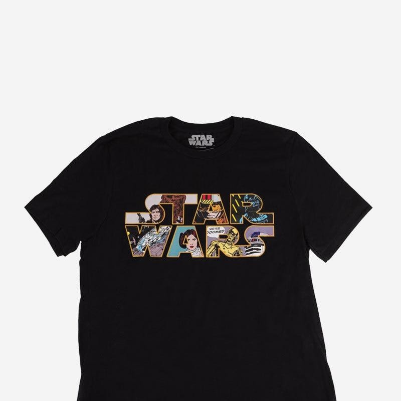 “This t-shirt features the comic book characters in the iconic Star Wars logo. Wear your Star Wars heart on your sleeve by sporting this classic look. May the Force be with you!”