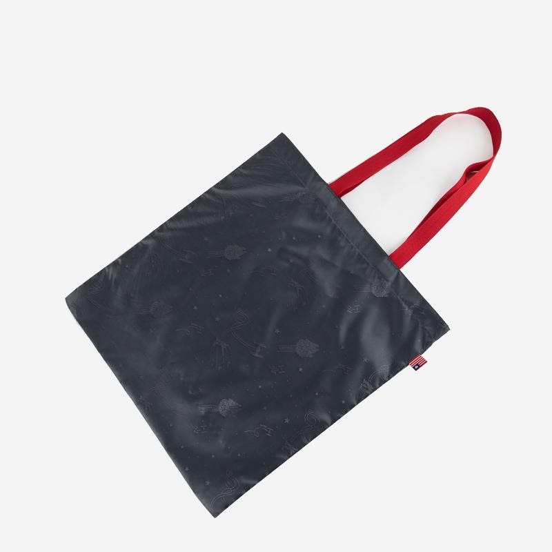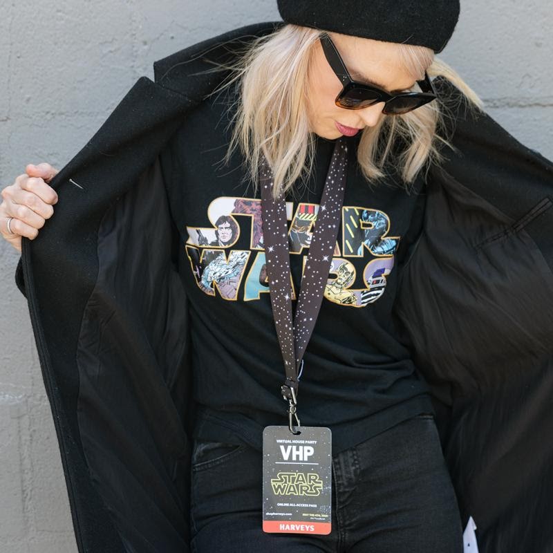“Harveys created a fun print featuring iconic scenes and favorite characters from the movie that started it all. Thoughtfully color blocked with an all-new galaxy print and fully lined with the exciting space battle liner. Wherever your loyalties lie, you can choose a side with the double-sided Imperial and Rebel insignia charm.”