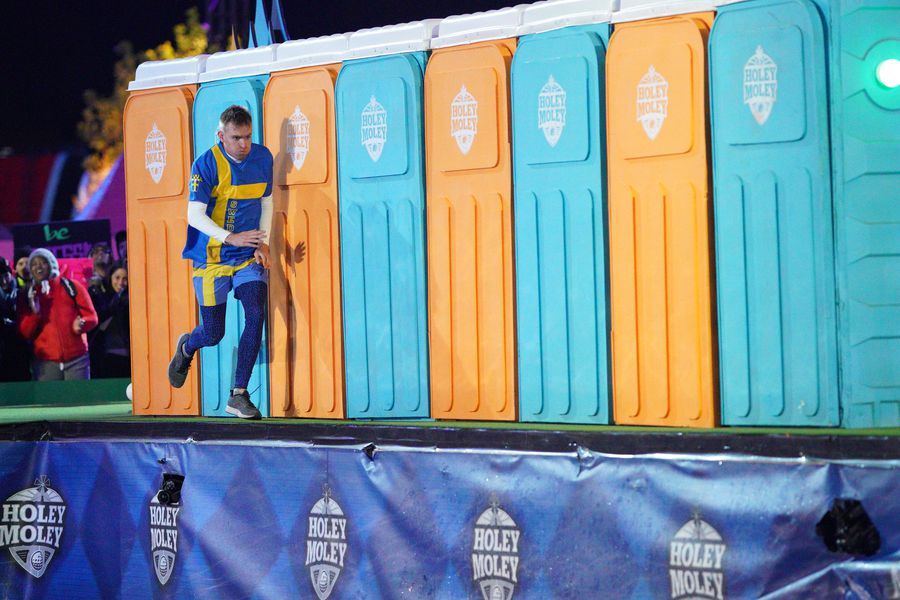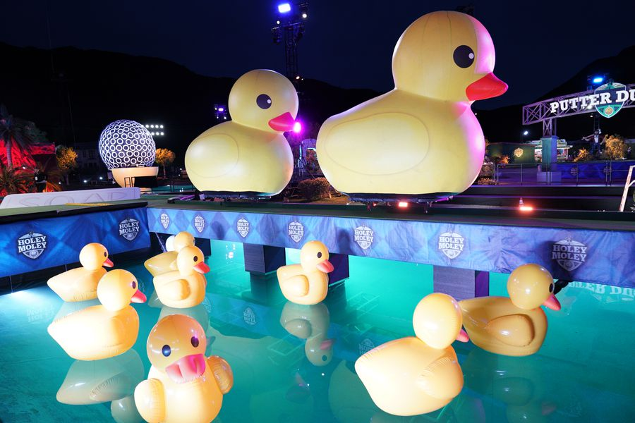 A lot of the marketing has focused on this green, known as “Hole Number Two” where golfers have to putt a down a narrow bath in front of a water pit with portable potties lining the walkway. They have to run past the doors in 2.5 seconds after putting the ball and if they get knocked into the river, they take a penalty. There are other similar obstacles, like the pirate-themed “Putt the Plank” where contestants have to ride a floating foam shark from one green to another (with a very special guest star).