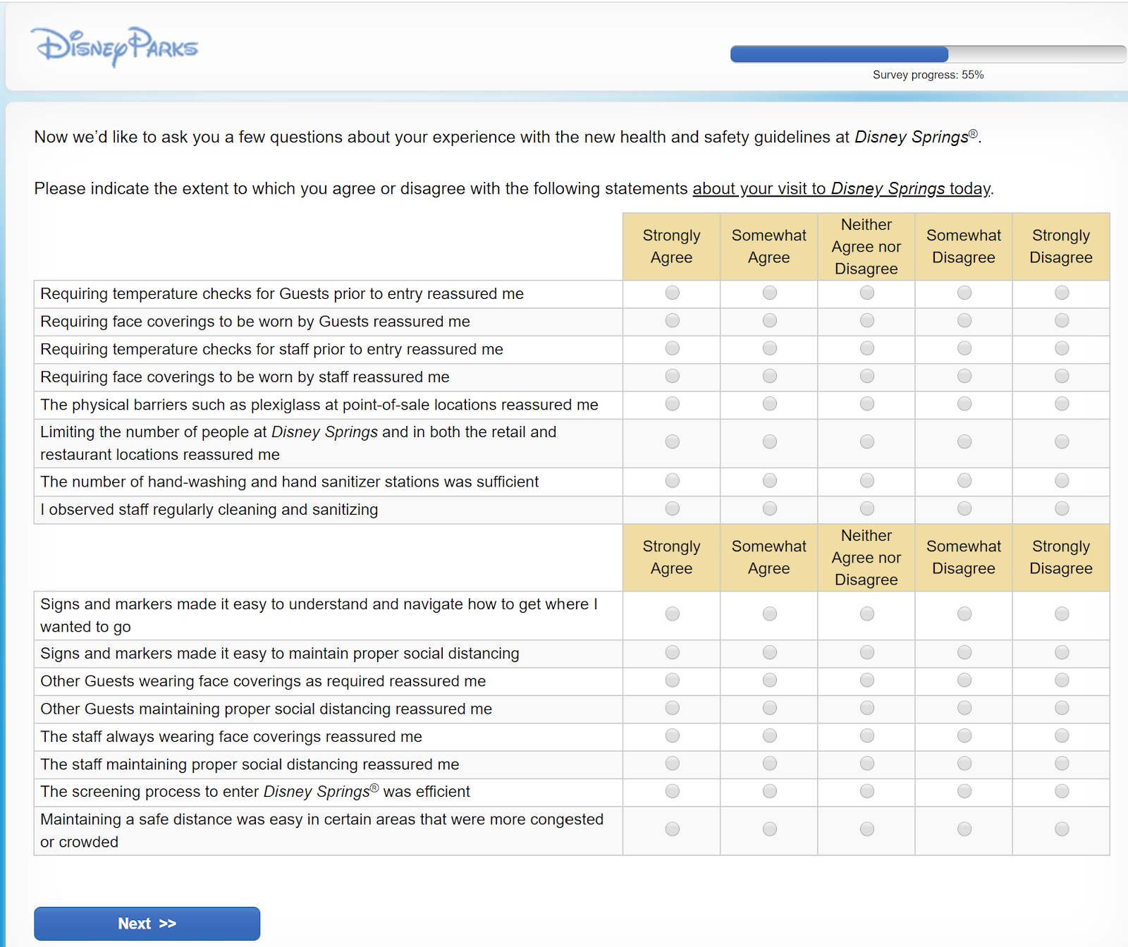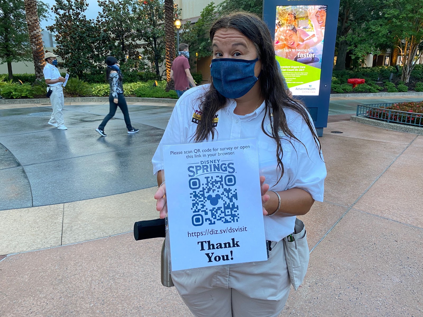 Today at Disney Springs we noticed Cast Members holding a sign with a website and QR code to take a survey. While the survey asked the typical guest experience questions, they added several questions regarding their COVID-19 policies and procedures.