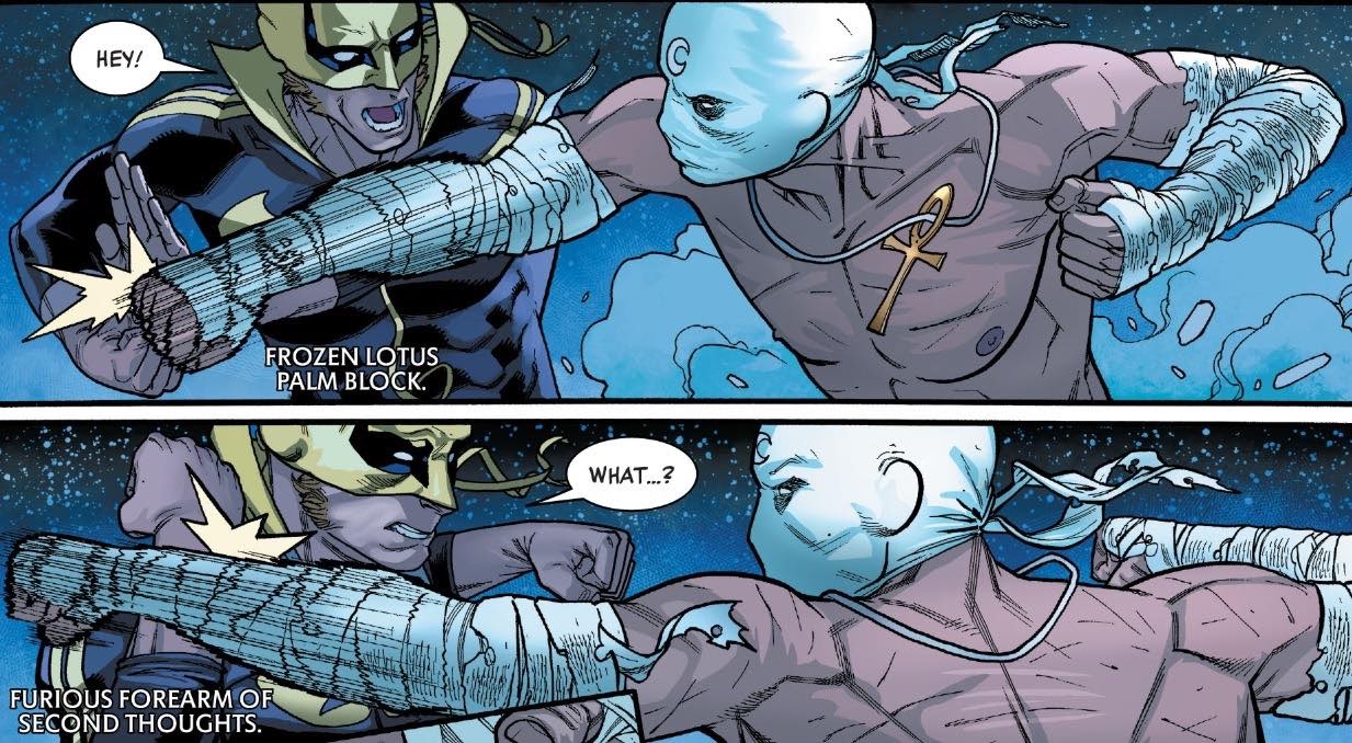 Nothing with Moon Knight ever seems exactly normal, but right from the beginning of this issue, you can tell something isn't quite right. The Fist of Khonshu is seen praying outside the gate of K’un-Lun before Danny Rand, known as the Iron Fist, confronts him. This isn’t your typical superhero meeting though as Moony quickly attacks him.