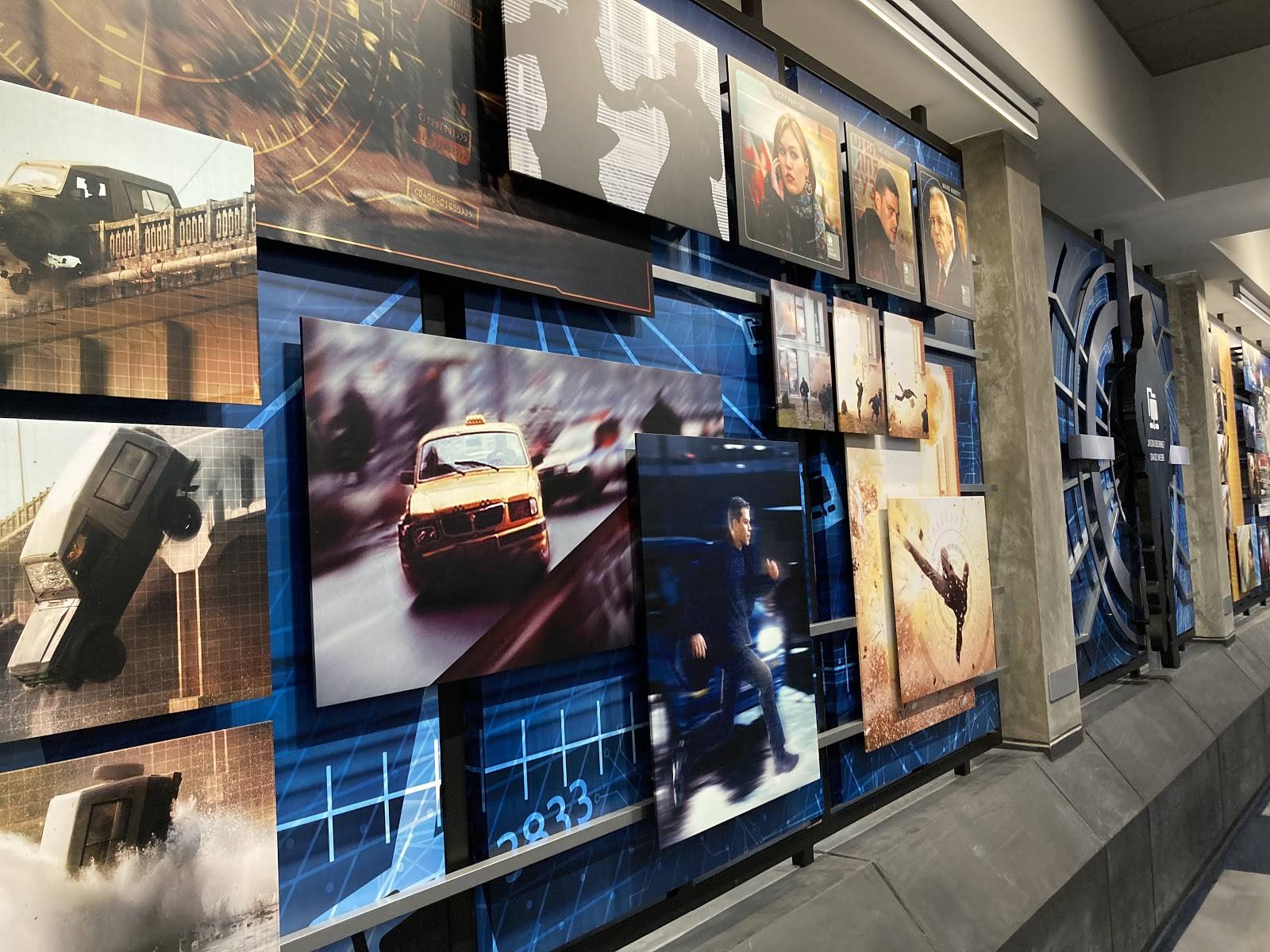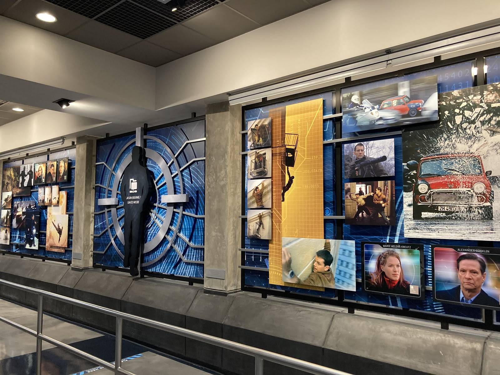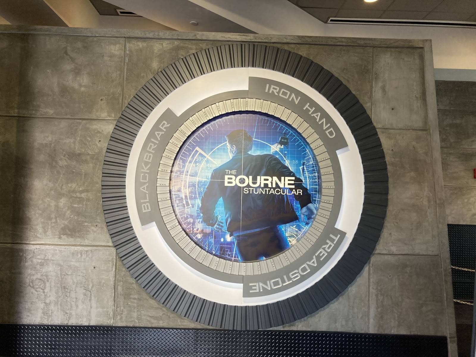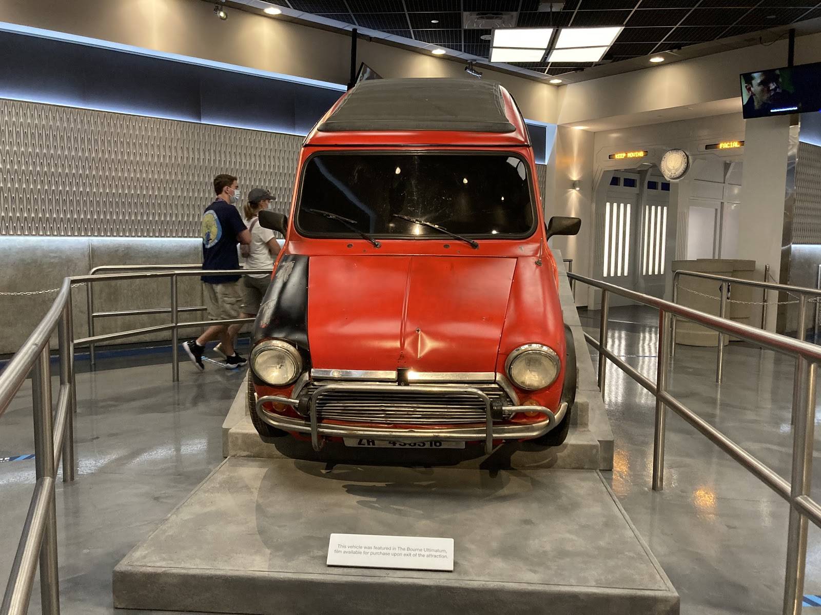 Once back inside the building (the outdoor section is skipped if you are directed to the left), guests will find several shots from the popular Bourne films on the walls, as well as a couple of prop vehicles. Additionally, there are dozens of monitors throughout the queue showing clips from the movies.