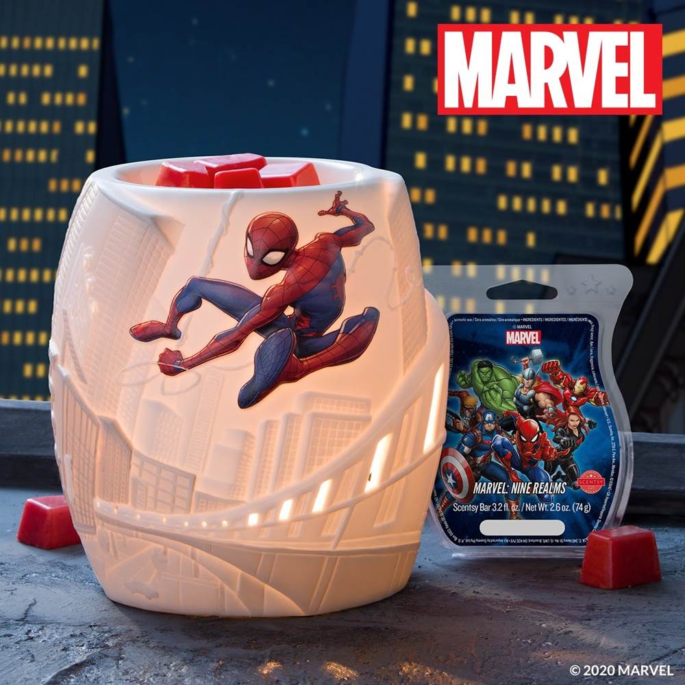 He can swing from a web and now he can add fragrance to your home. Peter Parker is swinging on an etched warmer to save a runaway train through the streets of New York with his web design engraved on the back and in the warmer trey. The Spider-Man Scentsy Warmer retails for $55.