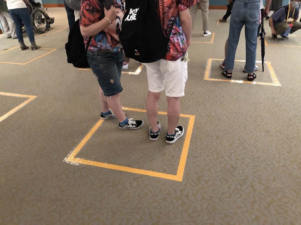 As Disney guests approach the turnstiles, they’ll notice spaced out yellow boxes where they are to stand as they wait for entry. Cast Members are checking temperatures of guests prior to letting them in the park.