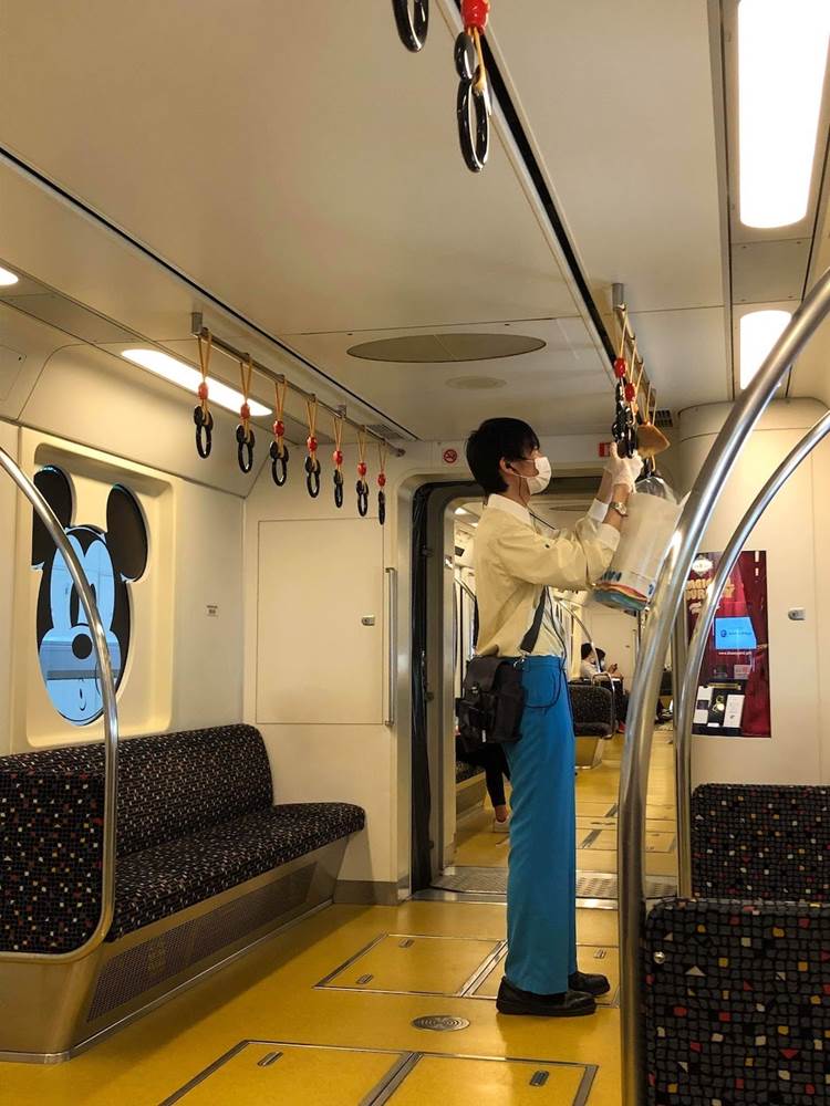 Finally, a Cast Member wipes off the hand grips and handrails inside the resort monorail.