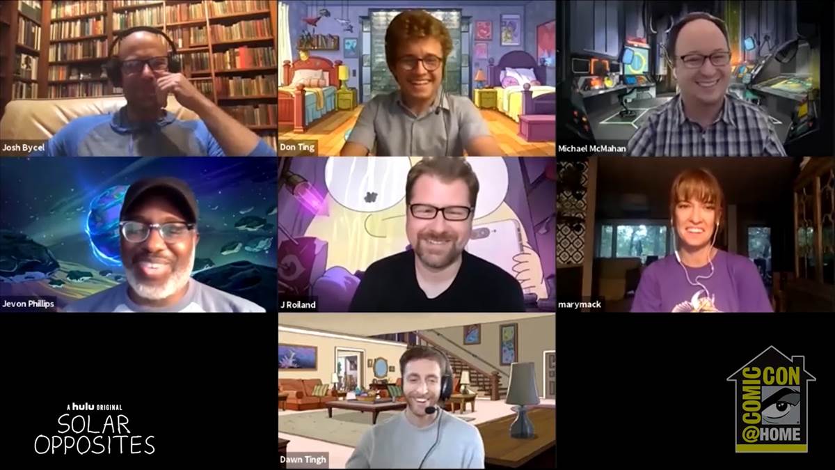 This morning’s virtual panel for Hulu’s Solar Opposites brought together series creators Mike McMahon and Justin Roiland (who also provides the voice of Korvo), plus cast members Thomas Middleditch (Terry), Sean Giambrone (Yumyulack), and Mary Mack (Jesse) along with executive producer Josh Bycel for a Q&A session moderated by Los Angeles Times reporter Jevon Pillips.