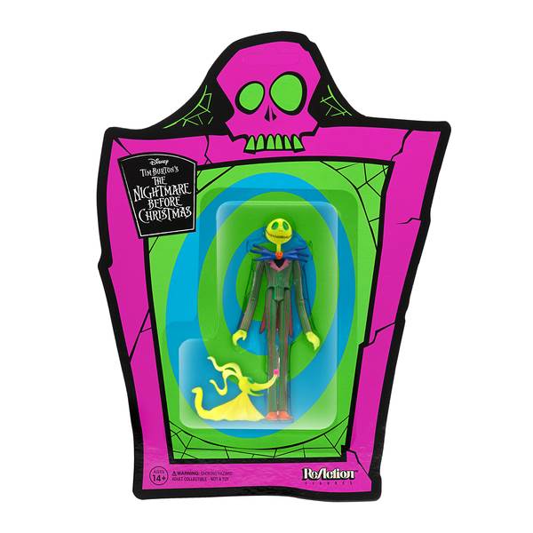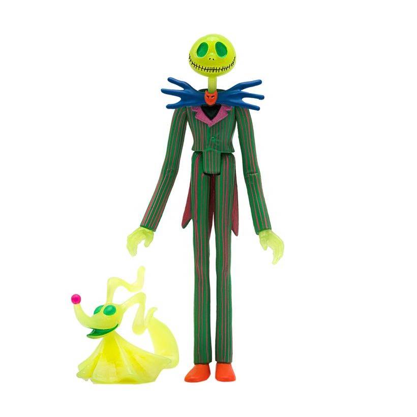 “Jack Skellington trades in his traditional black and white for a shocking Neon and Glow-in-the-dark look. Turn out the lights to see Jack and Zero glow! This limited edition 3.75” ReAction figure comes packaged on a die-cut tombstone cardback.”