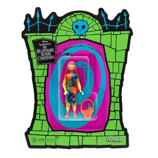 “Sally, bolder than you’ve ever seen her before! This 3.75” limited edition glow-in-the-dark ReAction figure comes complete with her picnic basket, packaged on a die-cut tombstone cardback, and is sure to brighten up any room with or without the lights on!”