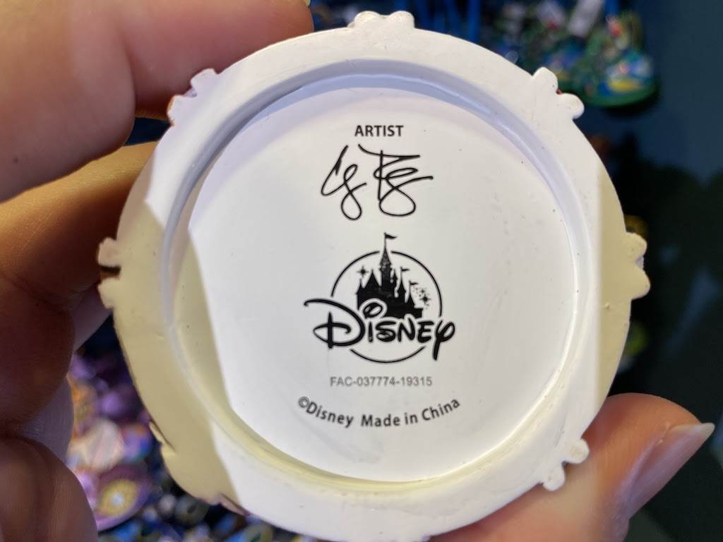 Elsa, Anna, and Olaf are all smiles on the front, while Sven and the snowgies have some glittery fun on the back. Along with the artist’s signature, the bottom of this figure is decorated with a brilliant snowflake.