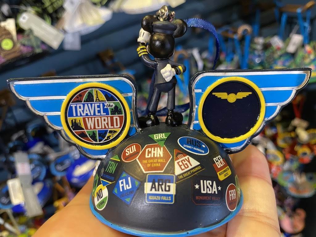 A very dapper Pilot Mickey stands atop this ornament that celebrates one of Disney’s best attractions. Mickey is flanked by big blue wings that are decorated with travel patches, while the pack of the figure features stamps from the many locations visited during the ride.