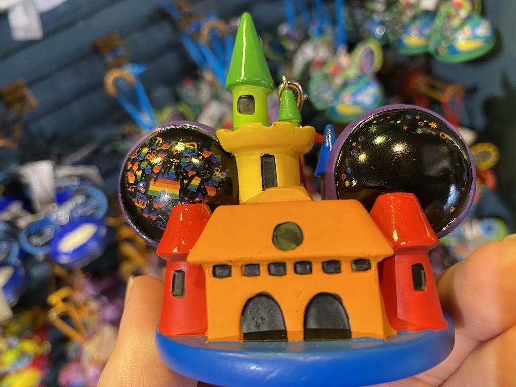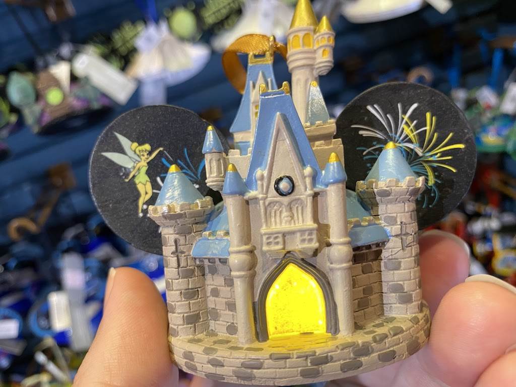 Magic Kingdom’s center icon looks great no matter the size. This design features a wand waving Tinker Bell adding a touch of pixie dust to the castle during the nightly fireworks spectacular. But that’s not all, this lovely ornament lights up too!