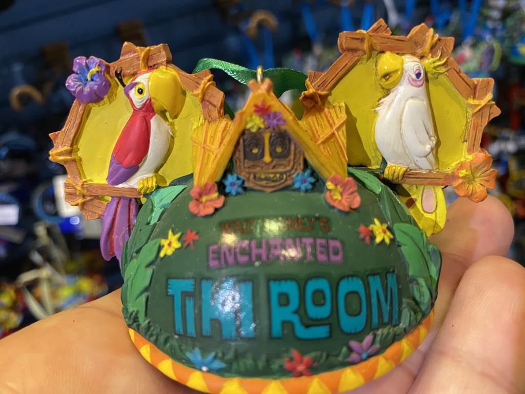 You’ll croon and coo—just like the birds and flowers in the opening day attraction—when you see this colorful Tiki Room ornament. The front features birds and flowers; the back has tiki statues; and the bottom has a tiki idol.