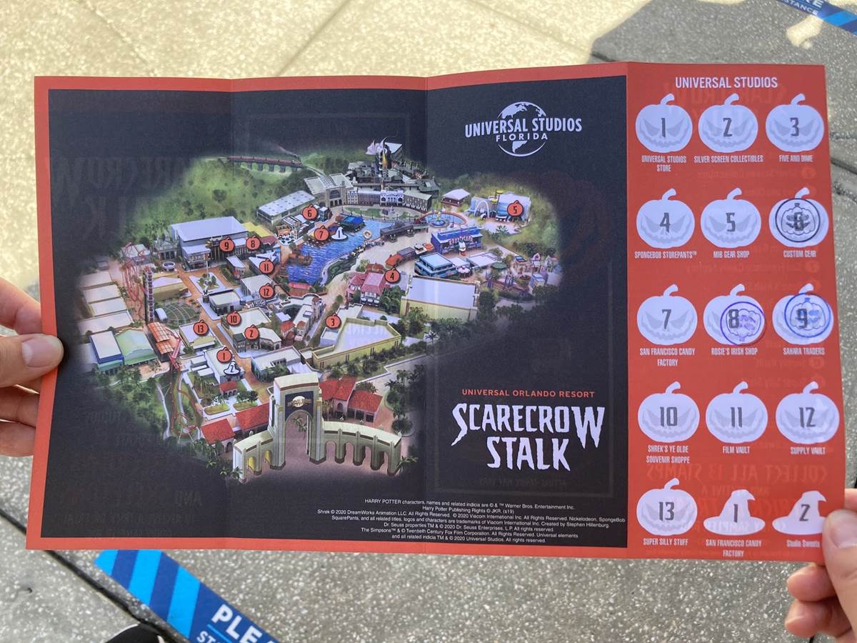 The Scarecrow Stalk consists of 13 scarecrows and skeletons found in 13 different shops around Universal Studios Florida. Guests can pick up one of the maps seen above in any of the 13 locations.