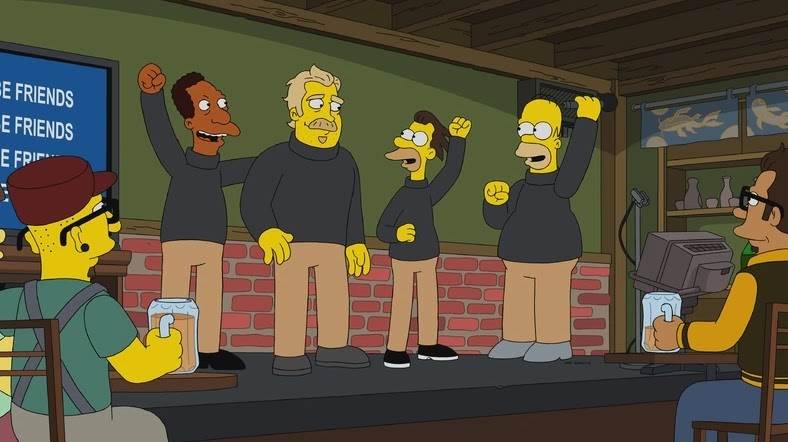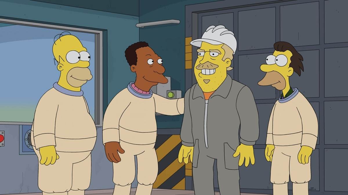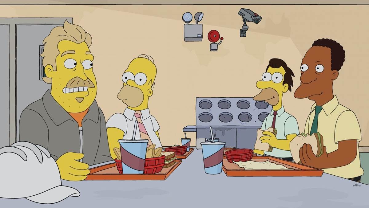 He hires the face-mask specialist from the Mission: Impossible movies and adds a robot body costume and voice modulator to turn himself into Fred Cranepool (guest star David Harbour from Stranger Things) from turbine maintenance. Homer (Dan Castellaneta), Lenny, and Carl invite Fred to sit at their table at lunch, and at the start Burns acts like his usual self. We see him via Iron Man-vision as he probes his employees about their complaints. Then they run from the hounds that chase them after each lunchtime. “I guess when you’re on the other side of it, releasing hounds can be… cruel?” Burns/Fred gives each of them a buffalo nickel and Homer invites him to Moe’s (as featured on I’ll Drink What Phil’s Drinking with Phil Rosenthal). Burns agrees and signals smithers with a miniature rocket.