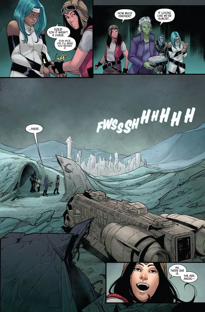I’ve said in other recent reviews of this Doctor Aphra comic how much I appreciate that the series has returned to the character’s archaeological roots, continuing Aphra’s growing legacy as the Indiana Jones of the Star Wars universe. That trend continues in issue #4, as the good doctor and company must make their way through the catacombs while avoiding the siren call of the living city of Vaale’s built-in security system, which drives invaders mad through an aural attack on their brain waves. Along the way I’ve really come to admire the detail that artist Marika Cresta is putting into her work for this title. Her evocative background and landscape drawings have a terrific way of conveying the desolation and ominous nature of Vaale, while her renderings of the comic’s characters make them all individually unique in their facial expressions and physical tics.