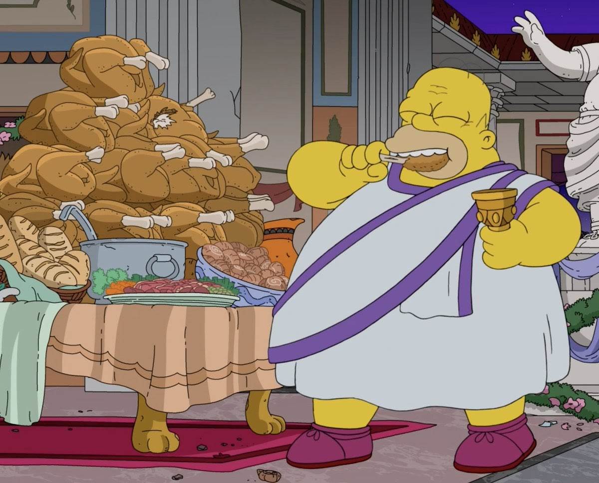 As the episode opens, our favorite family is at the museum looking at an ancient Roman exhibit. Homer (voiced by Dan Castellaneta) is bored, naturally, and Marge (Julie Kavner) says she wants him to show more ambition in his career so they can get more out of life, after he admits to having skipped a training program to be there. The museum curator (Monty Python’s Sir Michael Palin as this week’s guest star) interrupts out of nowhere to tell the arguing couple the story of Obeseus the Wide. “Once again, bickering in public gets us free therapy from strangers,” says Homer.