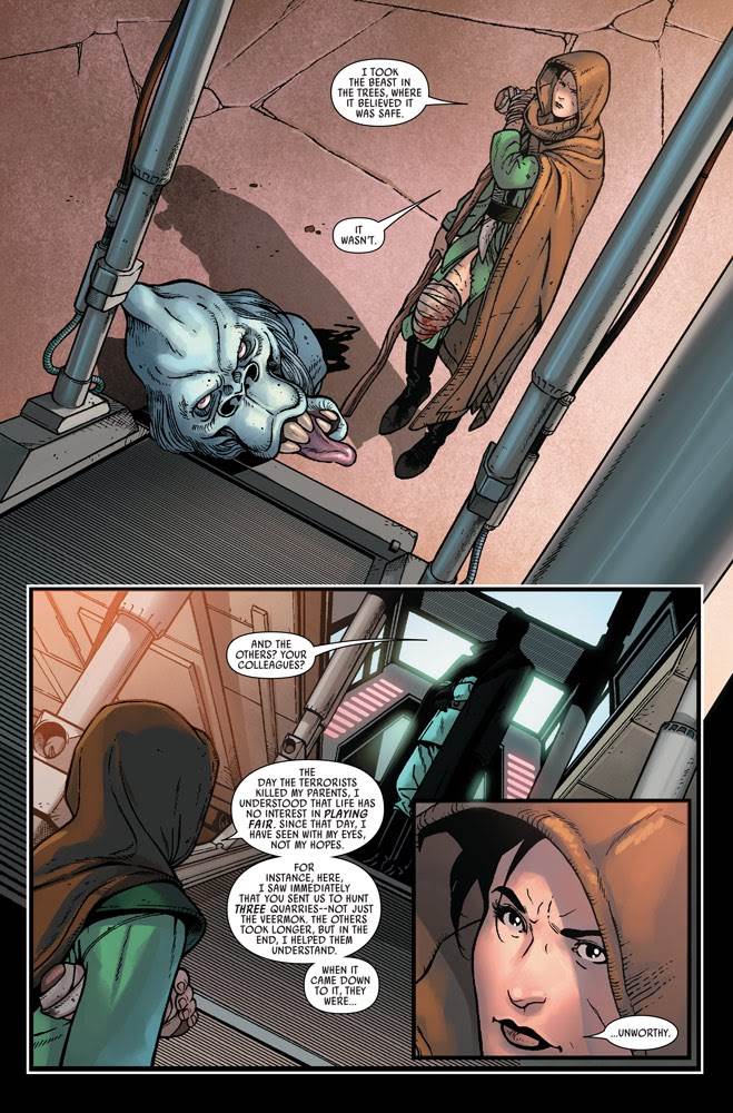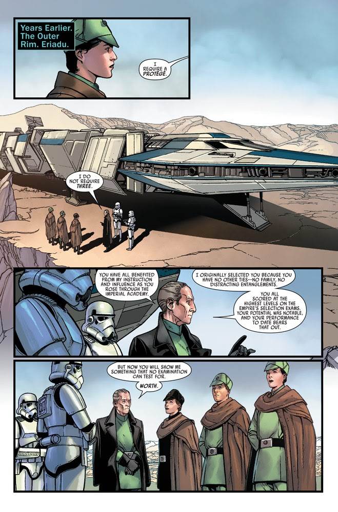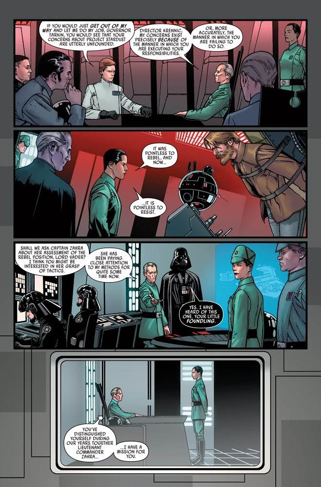 For this arc, Soule is teaming up with a different artist-- namely Ramon Rosanas of Star Wars: Age of Resistance, who draws both characters and locations like planetary vistas and spaceship interiors with crisp, clear, recognizable precision. The art is straightforward and attractive, allowing the reader to get lost in the story rather than distracted by flash and over-stylization. And Soule has still not lost his knack for grabbing fans’ attention, even when dedicating this many pages on what is essentially a brand-new character. We only see Luke and Leia for a couple panels, but I understand why the writer found Zahra’s history in the Empire compelling enough to not feel the need to check back in on our heroes. Plus, we get brief contextualizing cameo appearances by Director Orson Krennic (of Rogue One: A Star Wars Story fame) and the Dark Lord of the Sith himself, Darth Vader.