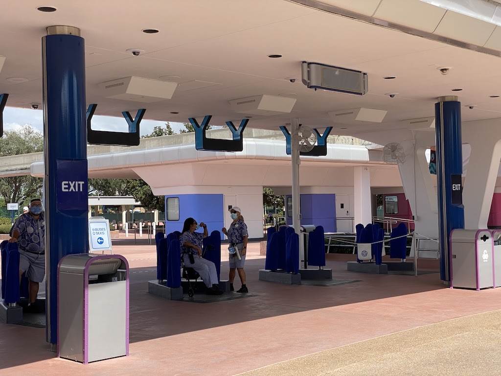 During our recent visit to Walt Disney World’s second park, we came across the changes made to the main entry. As guests arrive at the park and before they hit the turnstiles, they’ll see that the ticket booths have been painted white and blue. Also, each booth has one single queue line and social distancing markers on the ground.